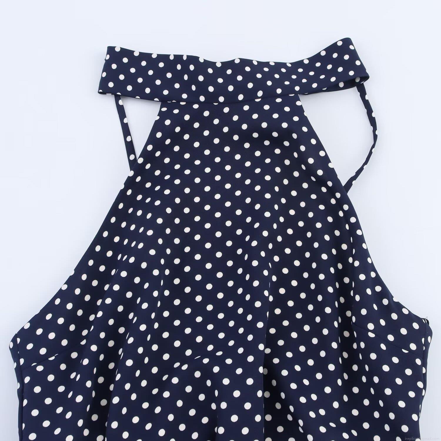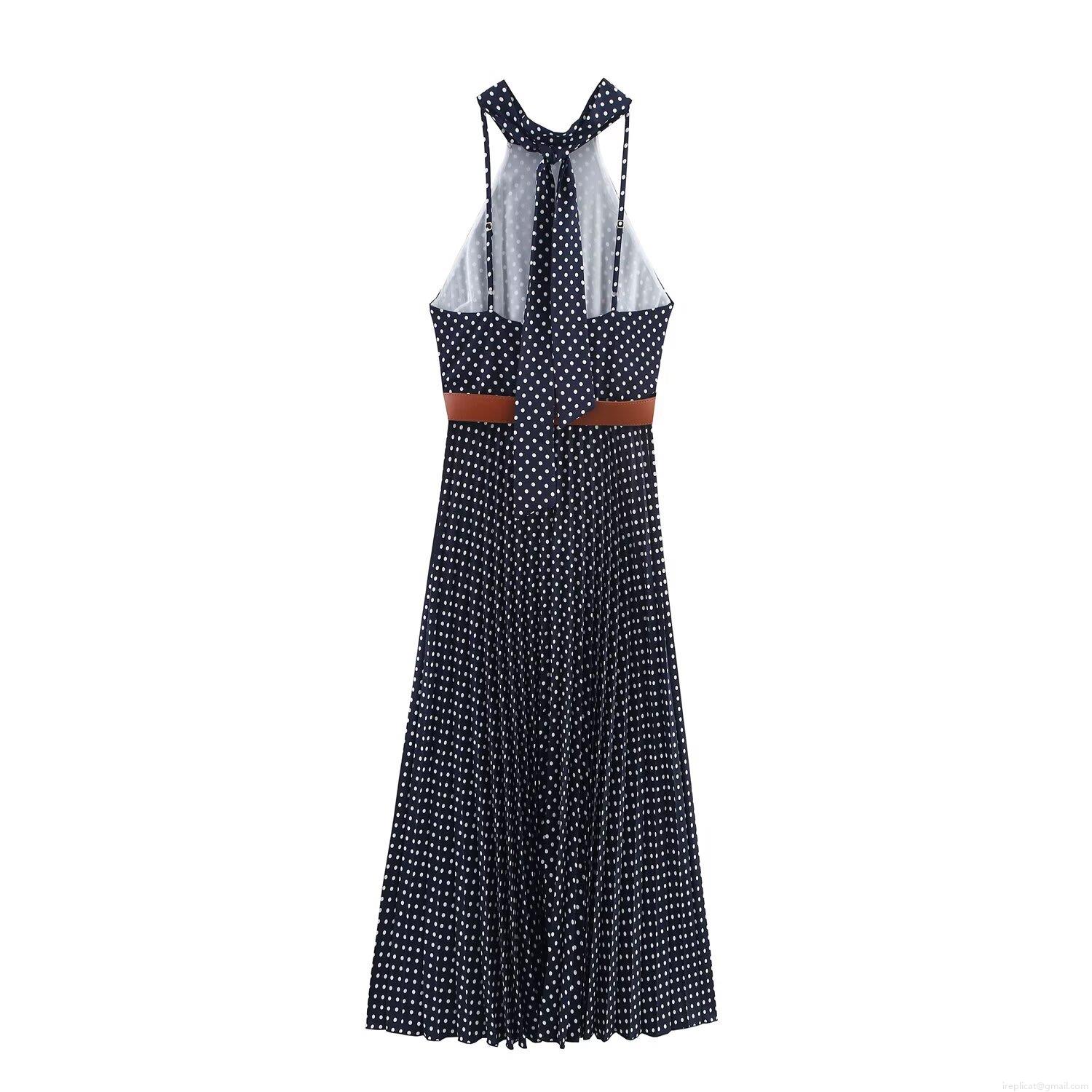 • Women's Maxi Dress Polyester Polka Dot Print Halter Neck Sleeveless Pleated Long Sun Dress For Summer Vacation Party Elegant Retro Style With Brown Belt