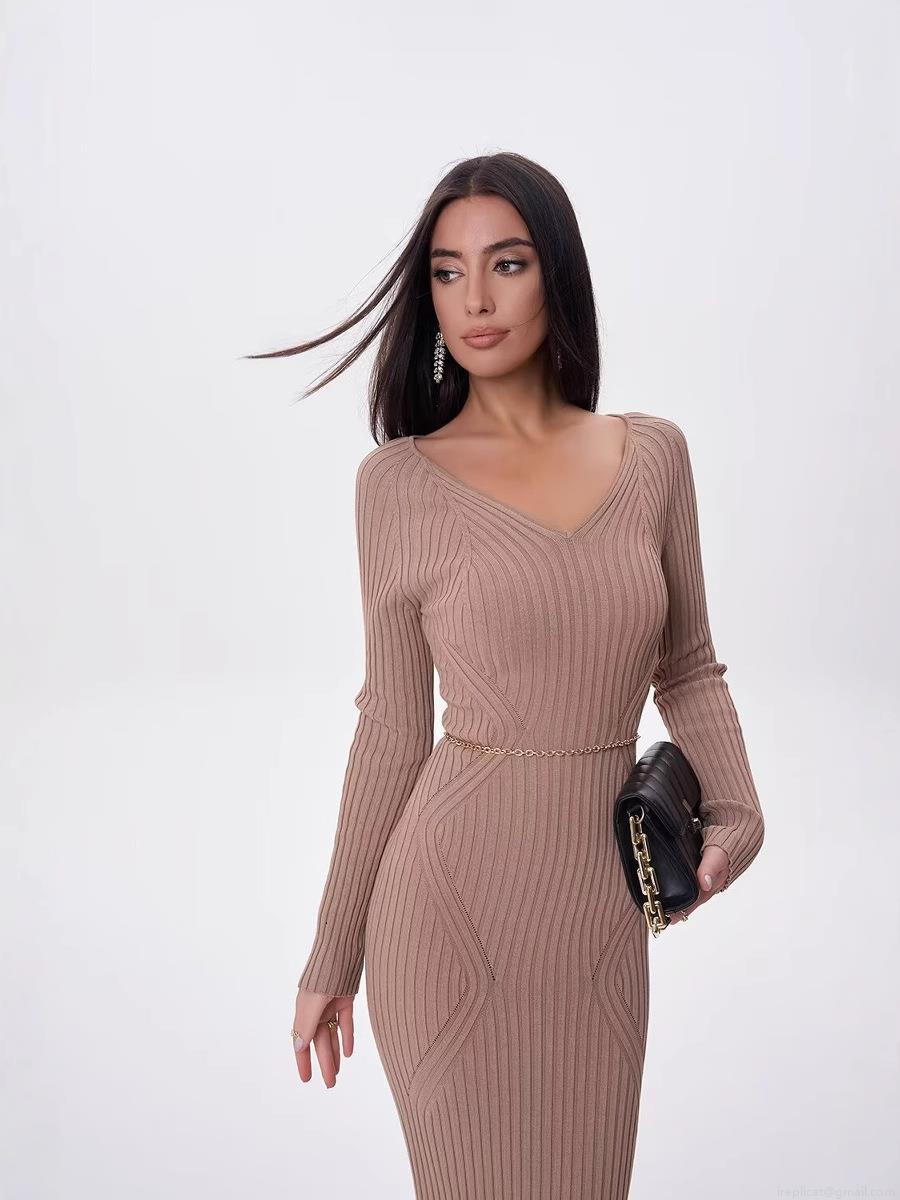 • Women's Maxi Dress V-Neck Ribbed Knit Slim Fit Long Sleeve A-Line Sweater Dress For Casual Party Streetwear Female Clothing