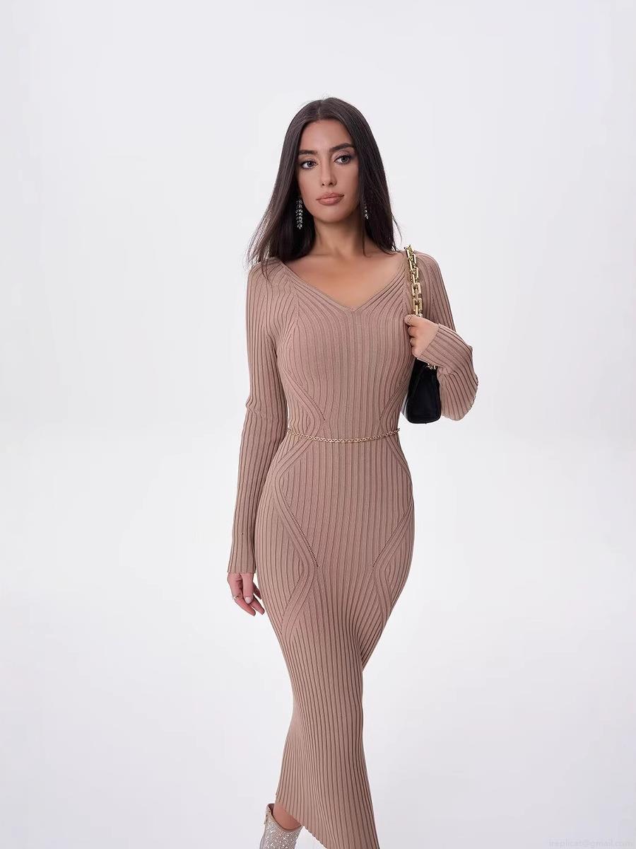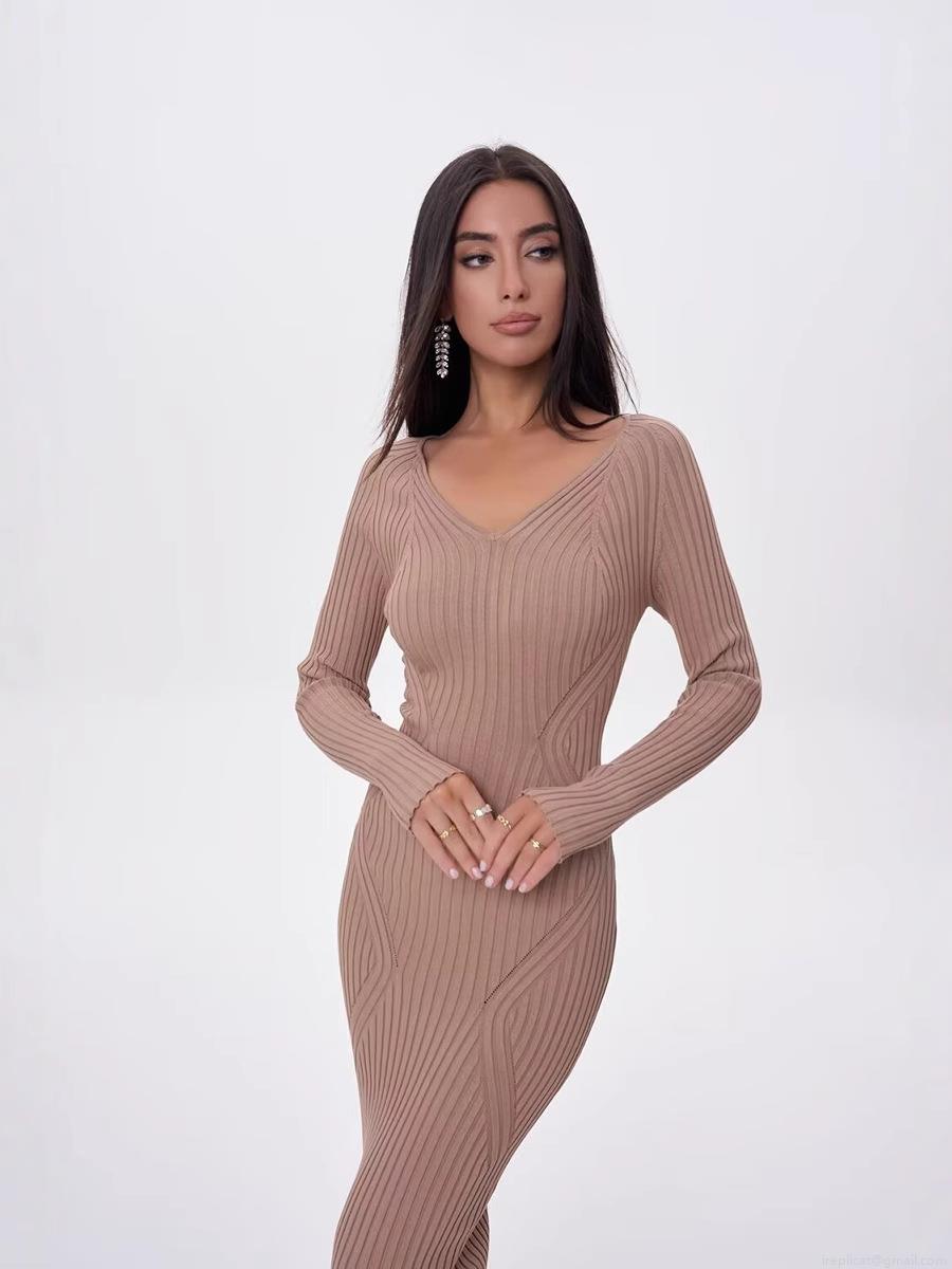 Women's Maxi Dress V-Neck Ribbed Knit Slim Fit Long Sleeve A-Line Sweater Dress For Casual Party Streetwear Female Clothing