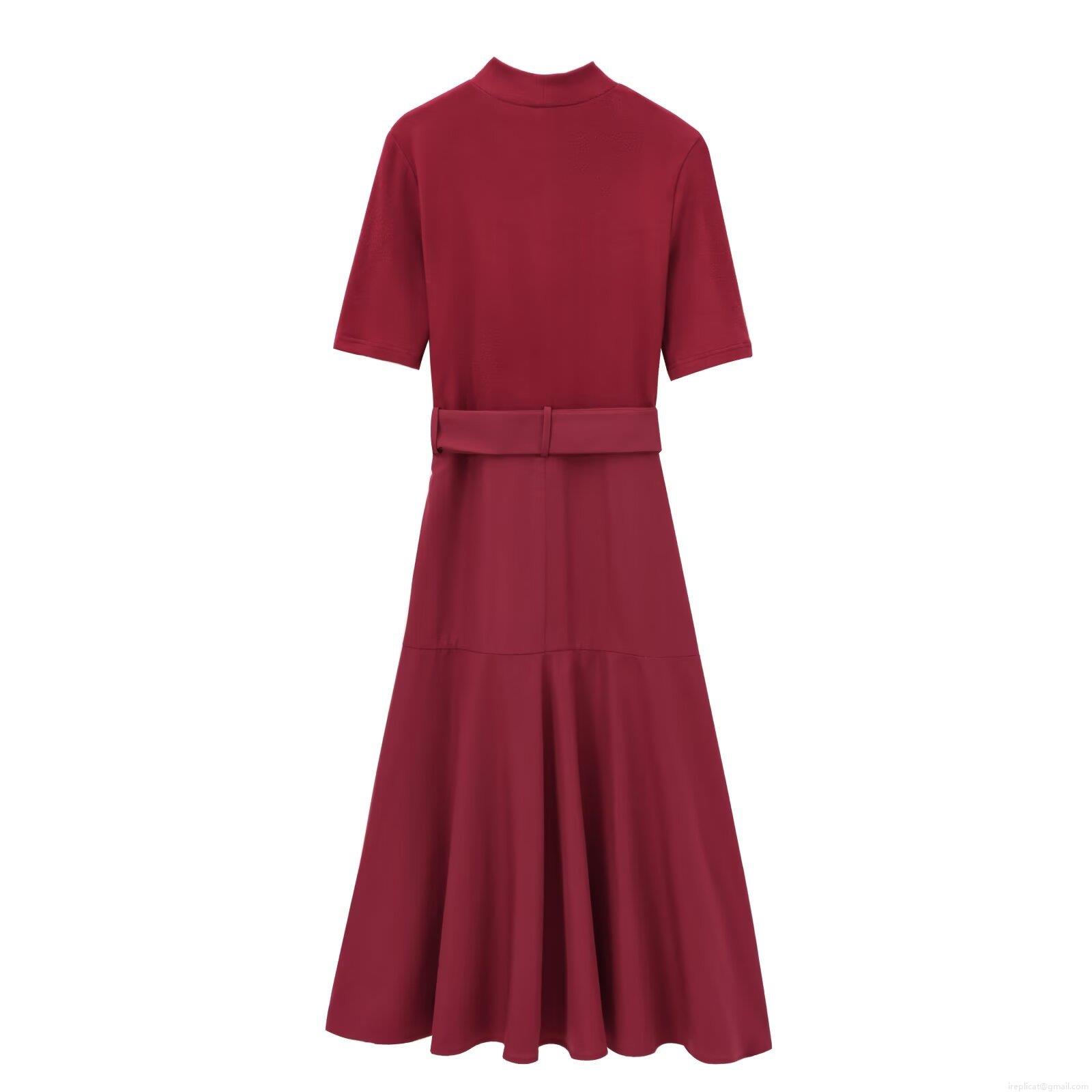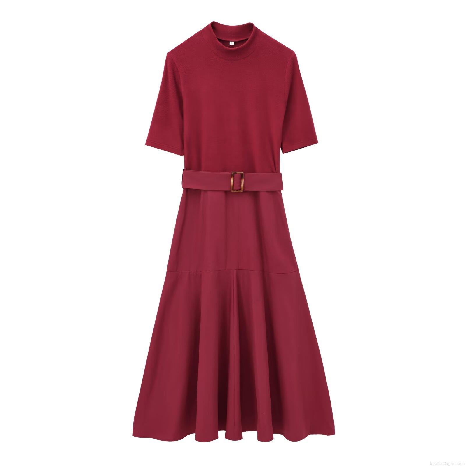 • Women's Mock Neck Short Sleeve Maxi Dress With Belt Wine Red Polyester Knit Solid Color A-Line Elegant Casual Streetwear Autumn Fashion Long Dresses
