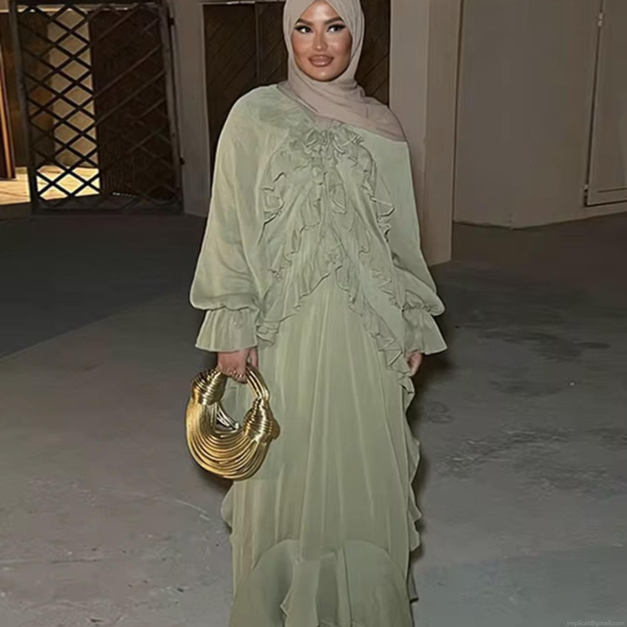 Women's Muslim Maxi Dress Elegant Tiered Ruffle Layered Chiffon Abaya Long Sleeve V Neck Solid Color Dress With Hijab For Wedding Party Evening Prayer Modest Kaftan