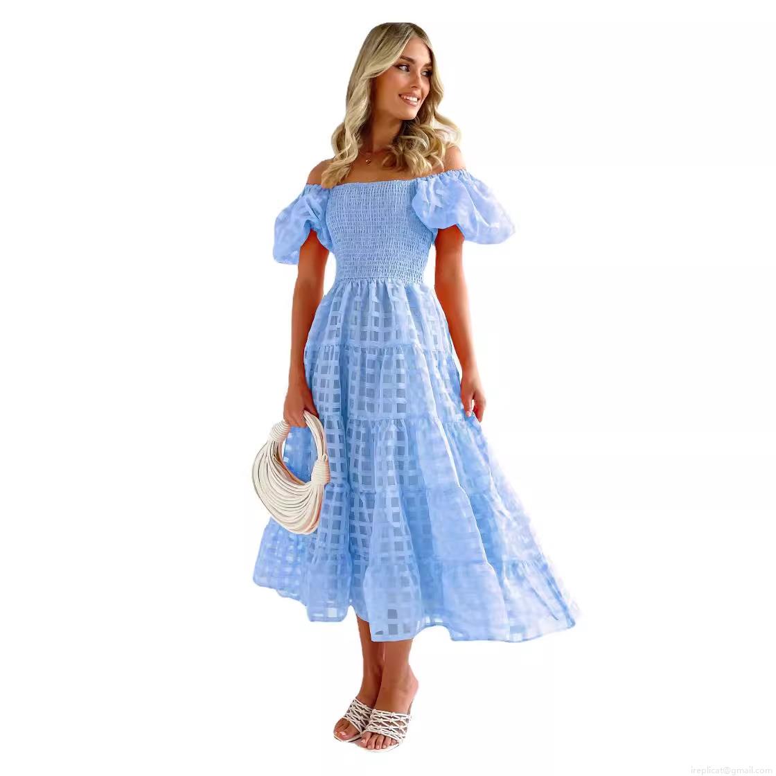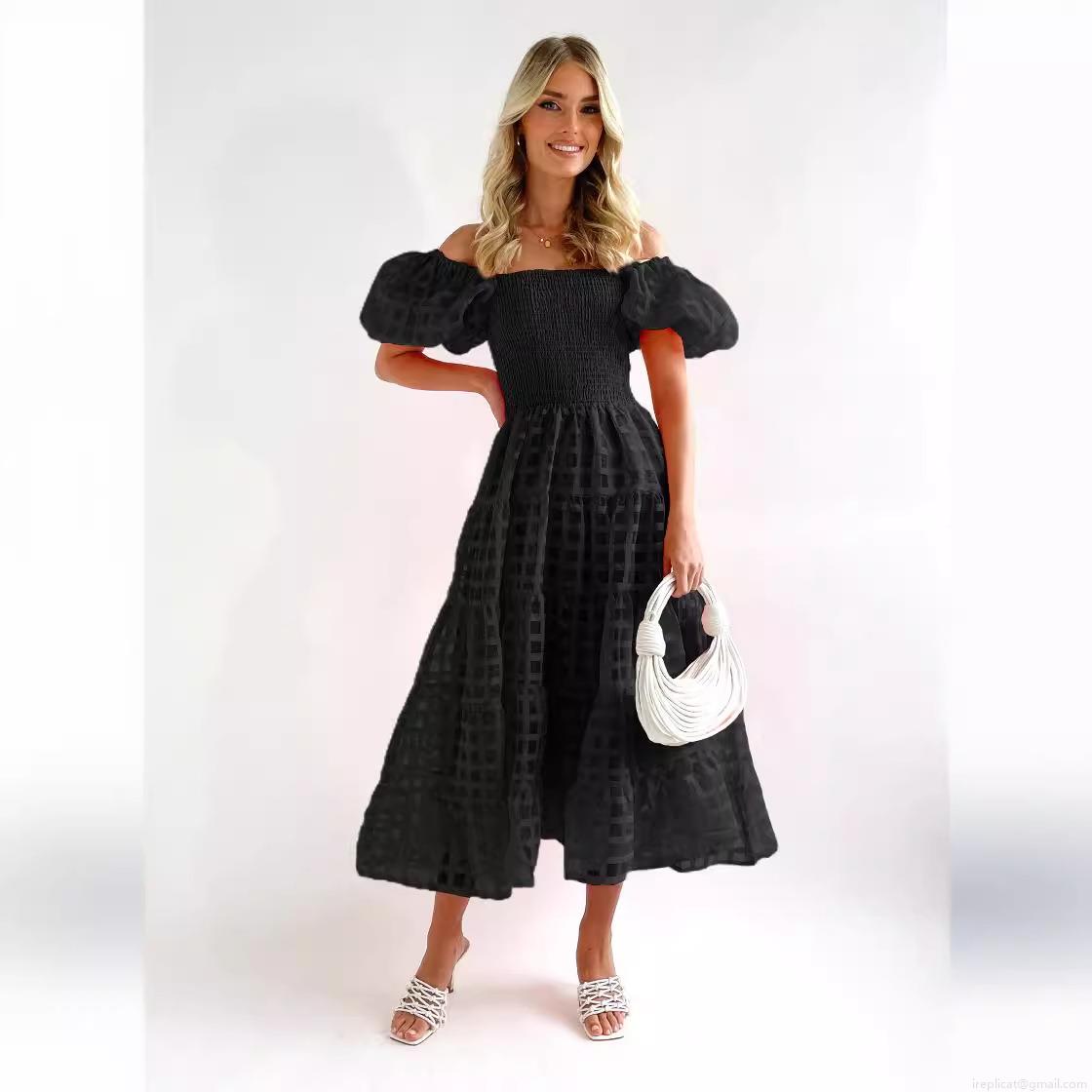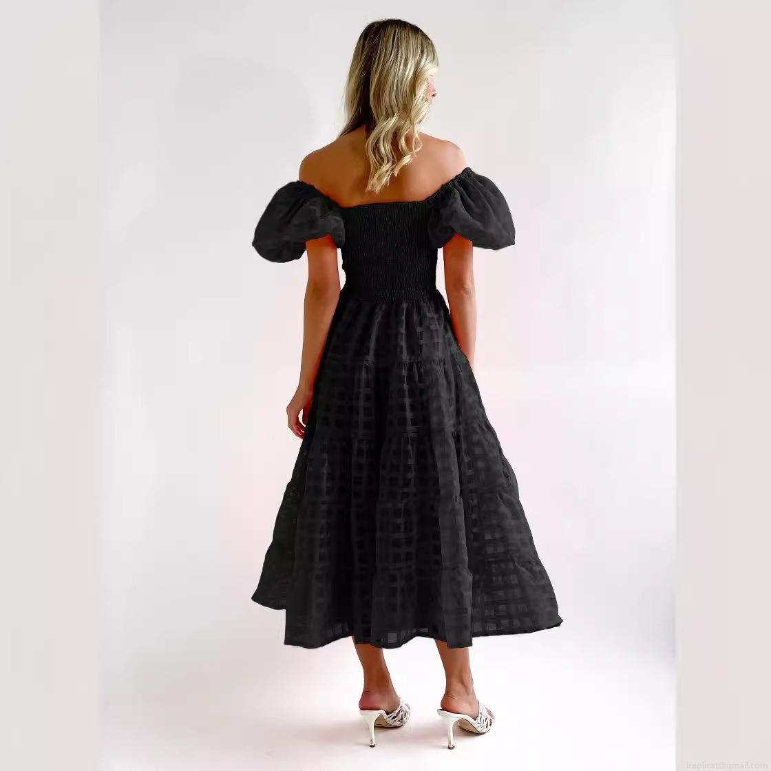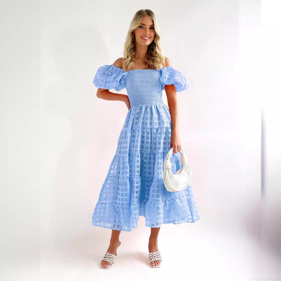 Solid Color, Pleats, Puff Sleeves, Cake Skirt, Off-shoulder, Multilayer Stacking, Grid Texture