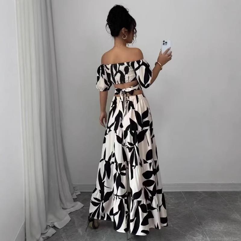 • Women's Off-Shoulder Maxi Dress Tropical Leaf Print Cut-Out Waist Tiered Cake Skirt Vacation Beach Short Sleeve Smocked Polyester Long Dress
