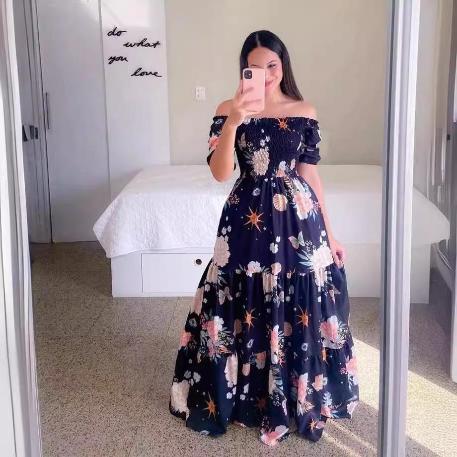 • Women's Off-Shoulder Printed Maxi Dress Polyester Smocked Tiered A-Line Long Dress For Summer Vacation Beach Party Bohemian Style Ladies