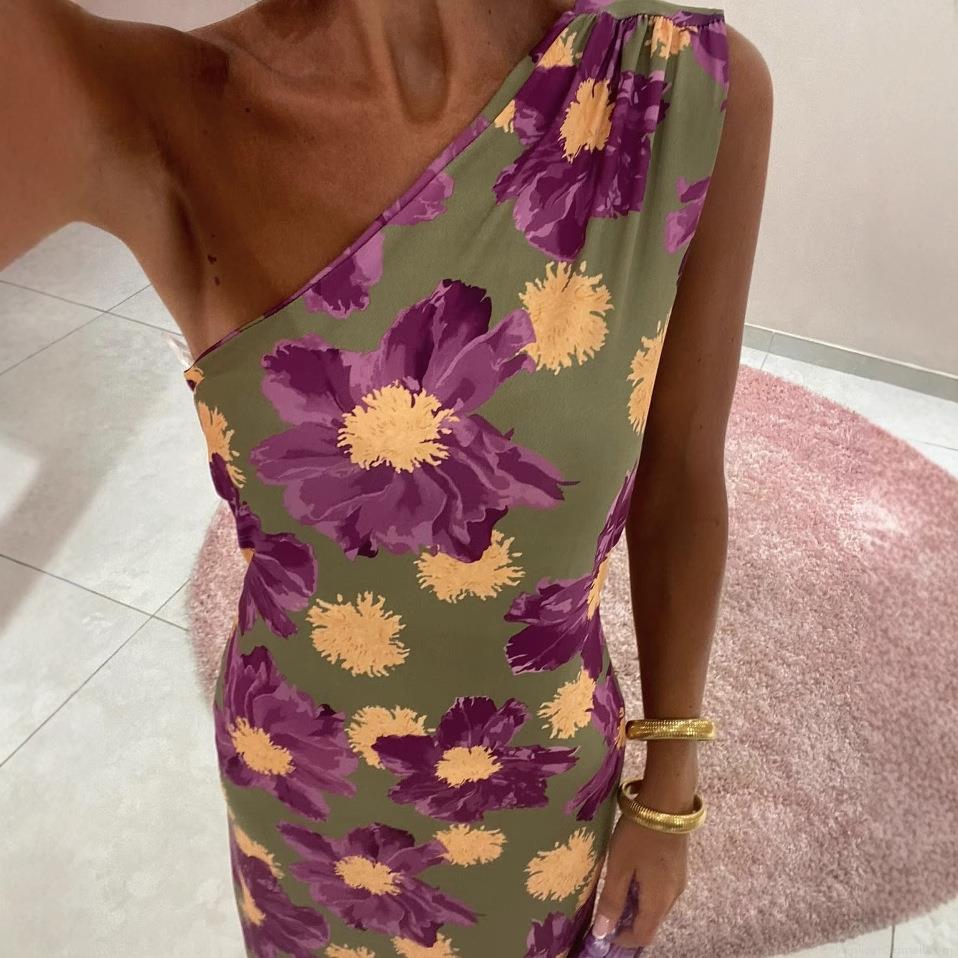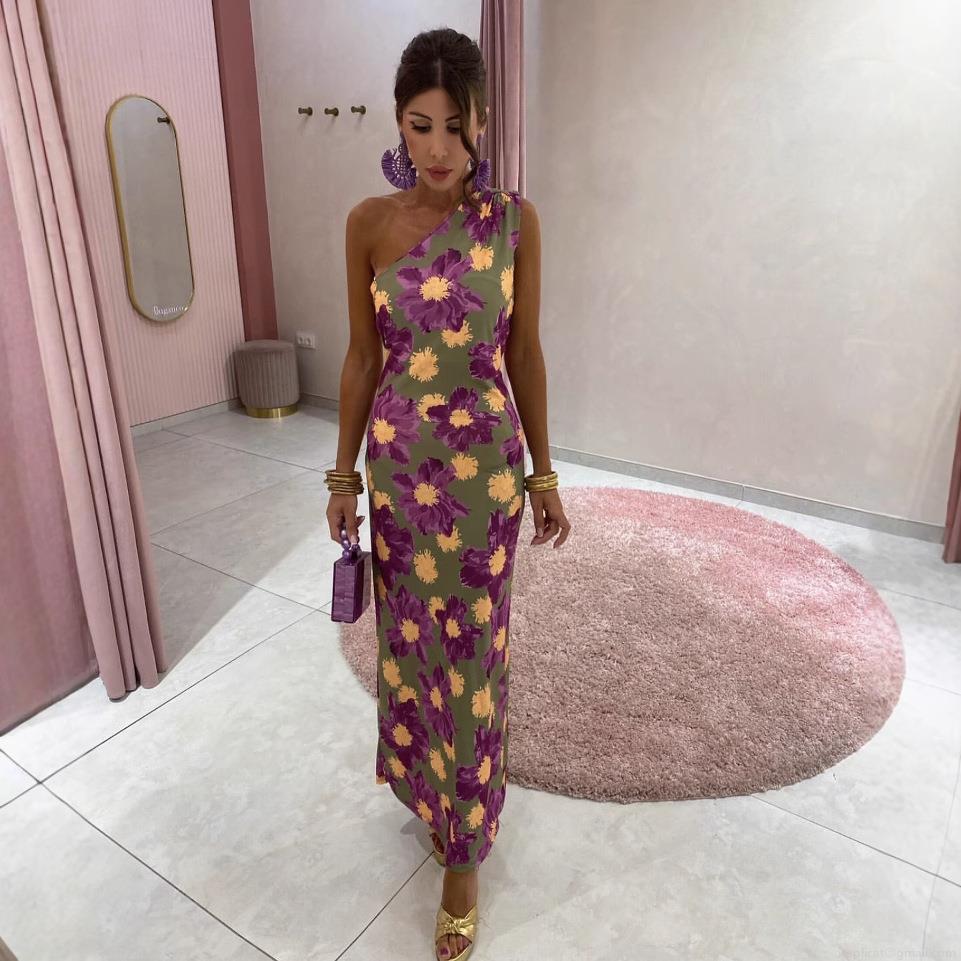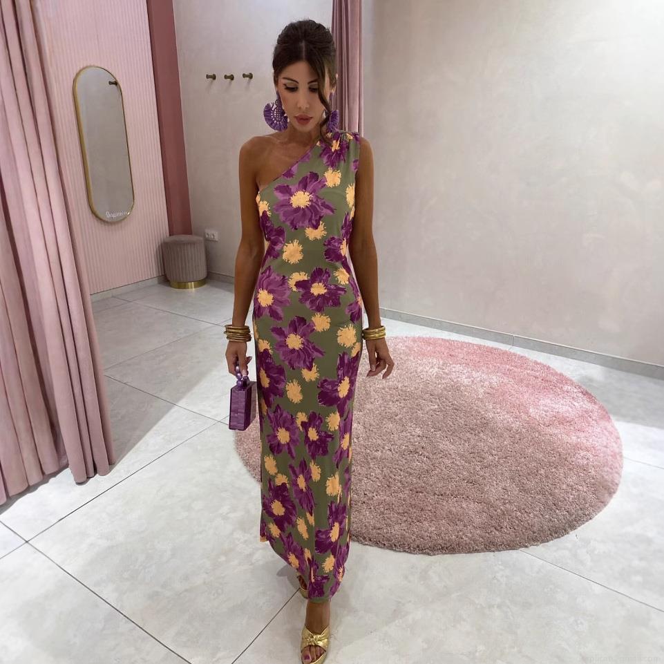 • Women's One Shoulder Floral Maxi Dress Polyester Blend Backless Ruched Large Daisy Print Vacation Party Elegant Sexy Long Dress