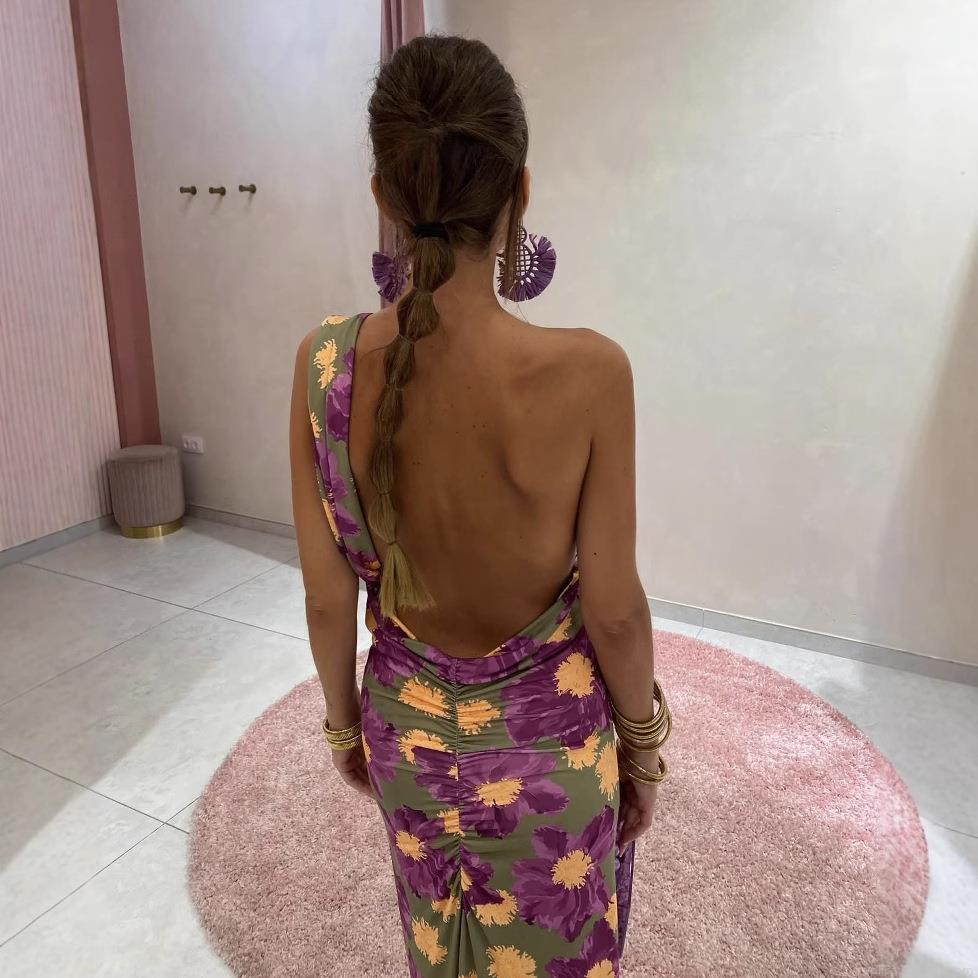 Women's One Shoulder Floral Maxi Dress Polyester Blend Backless Ruched Large Daisy Print Vacation Party Elegant Sexy Long Dress