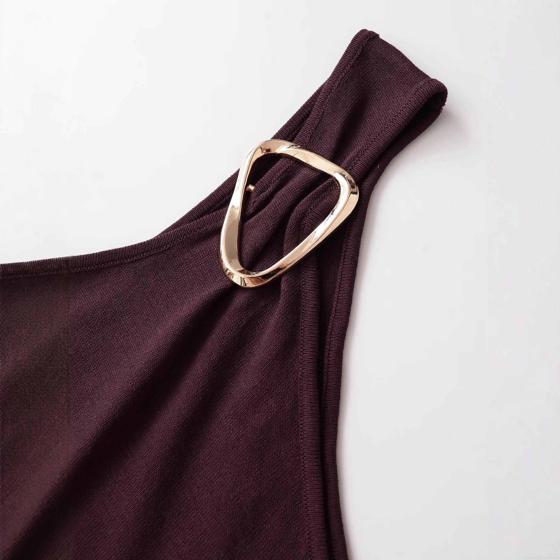 Solid Color, Metal Decorative Buckle, Fine Knit Texture, One-shoulder Design, Slit Hem