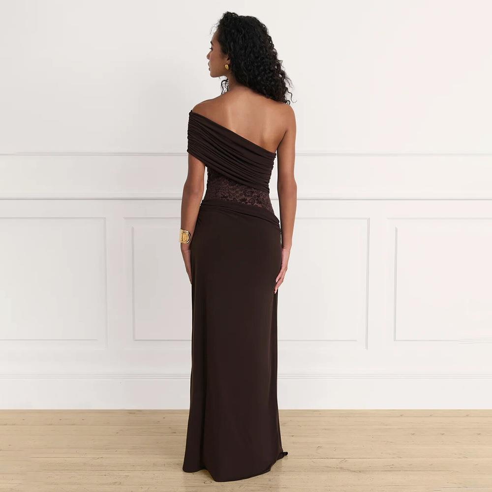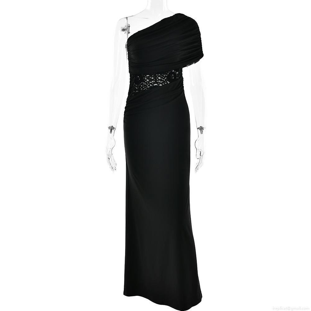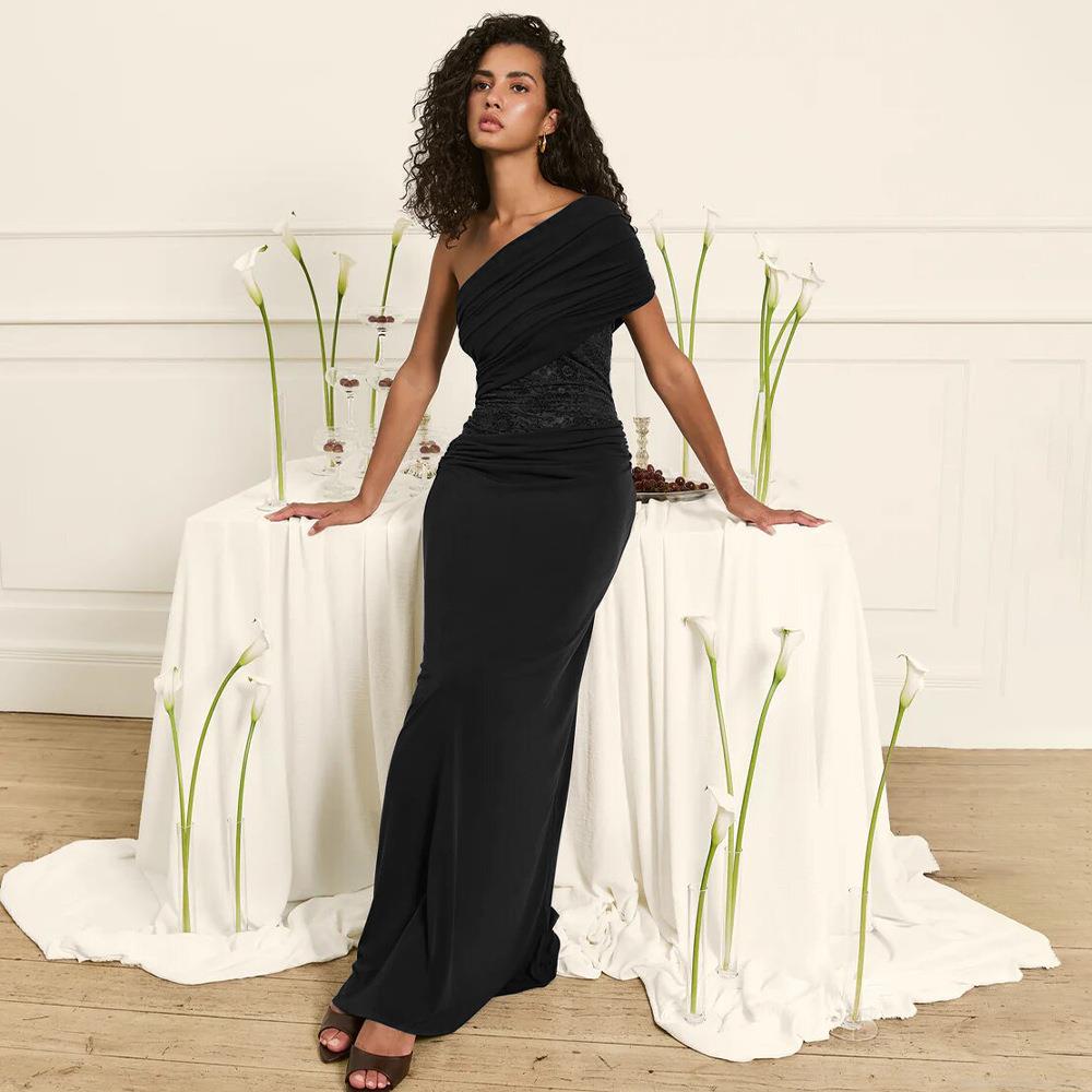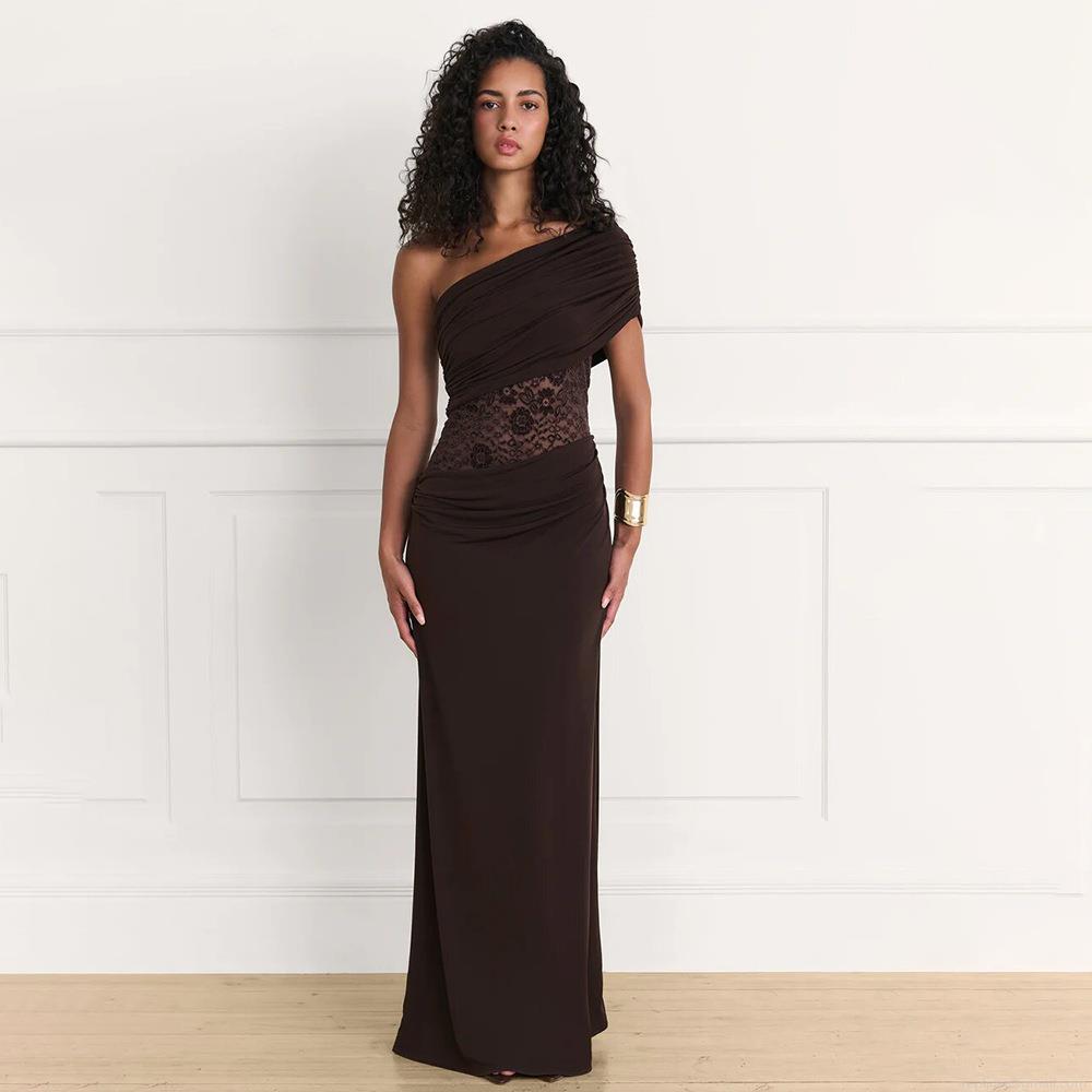 • Women's One Shoulder Maxi Dress Ruched Waist Sexy Bodycon Lace Patchwork Sleeveless Solid Color Gala Party Club Long Dress With Milk Silk Fabric