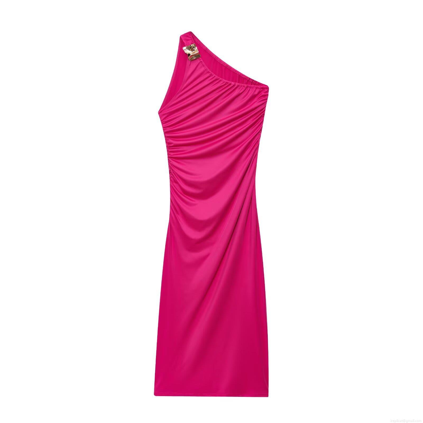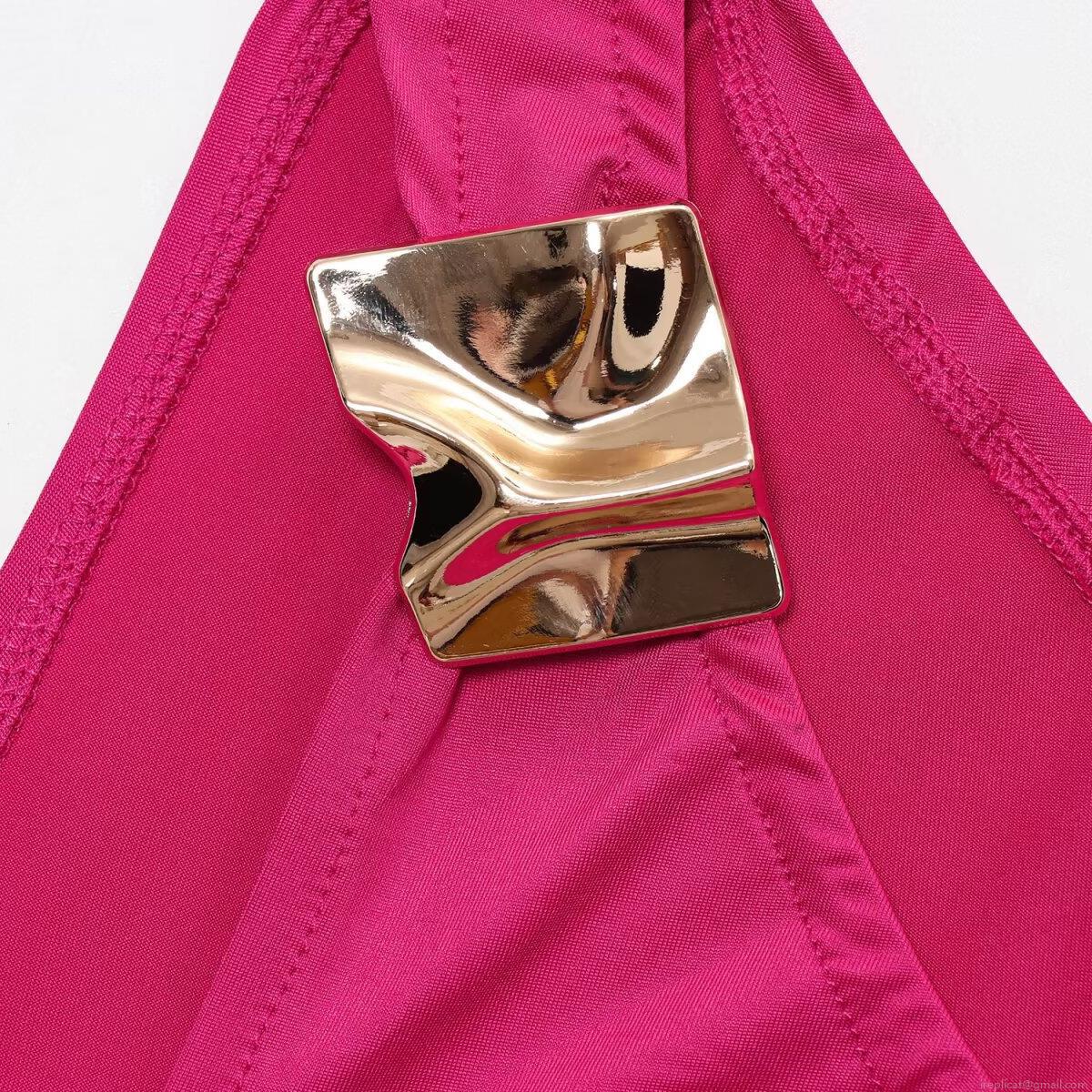 Women's One Shoulder Maxi Dress With Gold Metal Buckle Sexy Ruched Asymmetrical Sleeveless Bodycon Evening Party Long Dress Rose Red Polyester Spandex