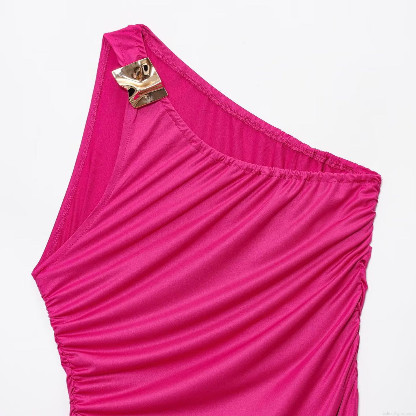 Solid Color, One Shoulder, Asymmetric, Pleats, Metal Buckle, Off-shoulder