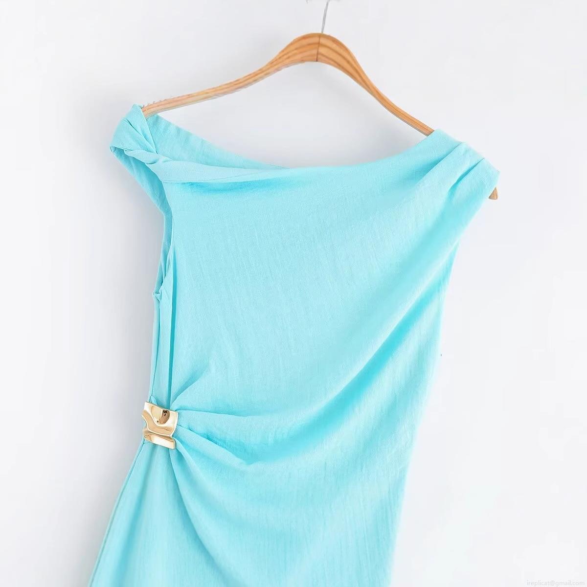 Solid Color, Off-shoulder, Sloping Shoulders, Metal Buckle, Irregular Buckle, Back Slit, Vertical Texture