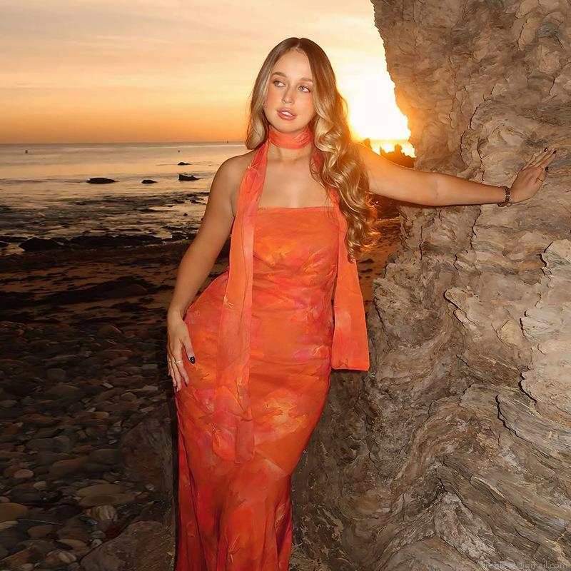 • Women's Orange Floral Print Mesh Maxi Dress Sexy Strapless Halter Vacation Long Dress With Matching Scarf For Summer Beach Party