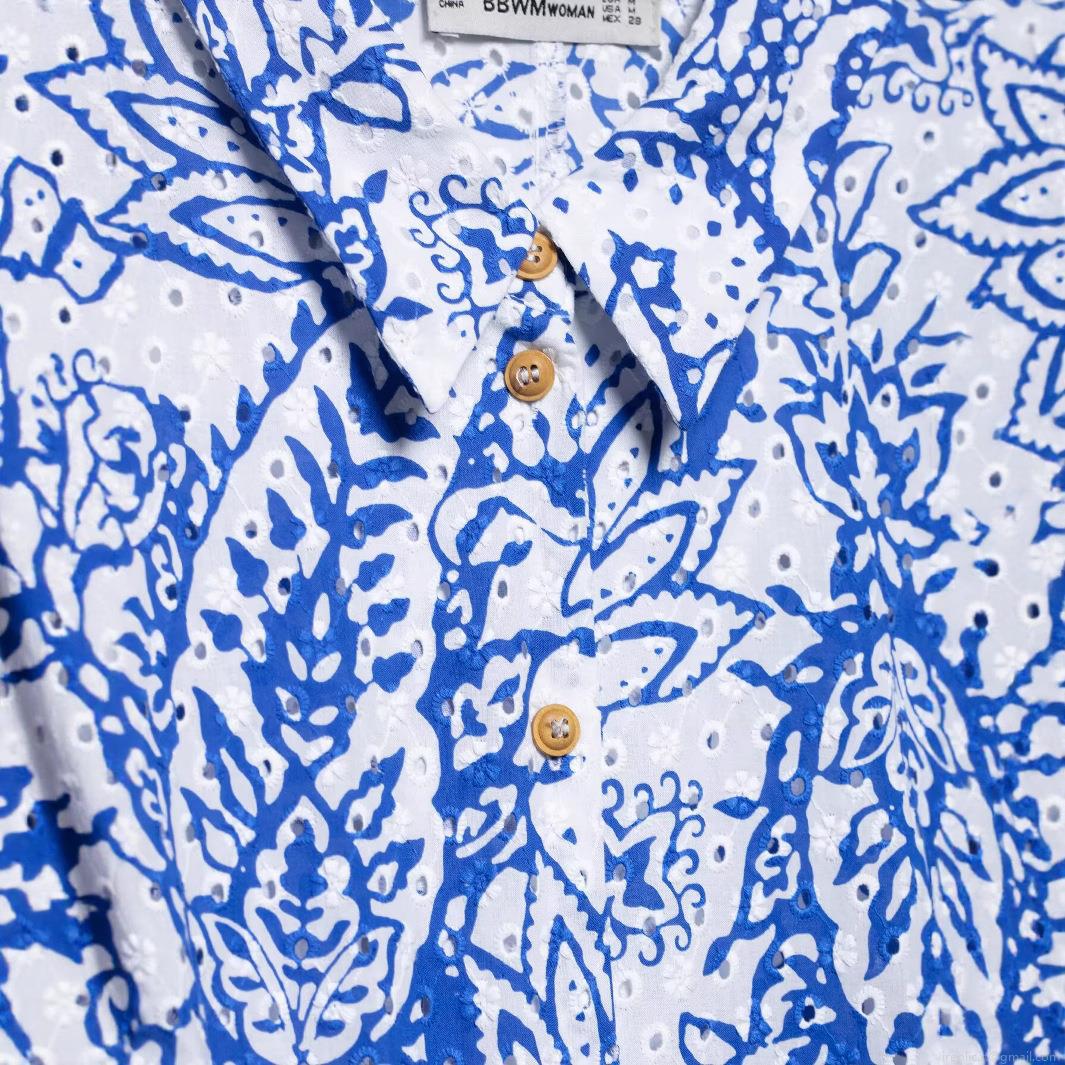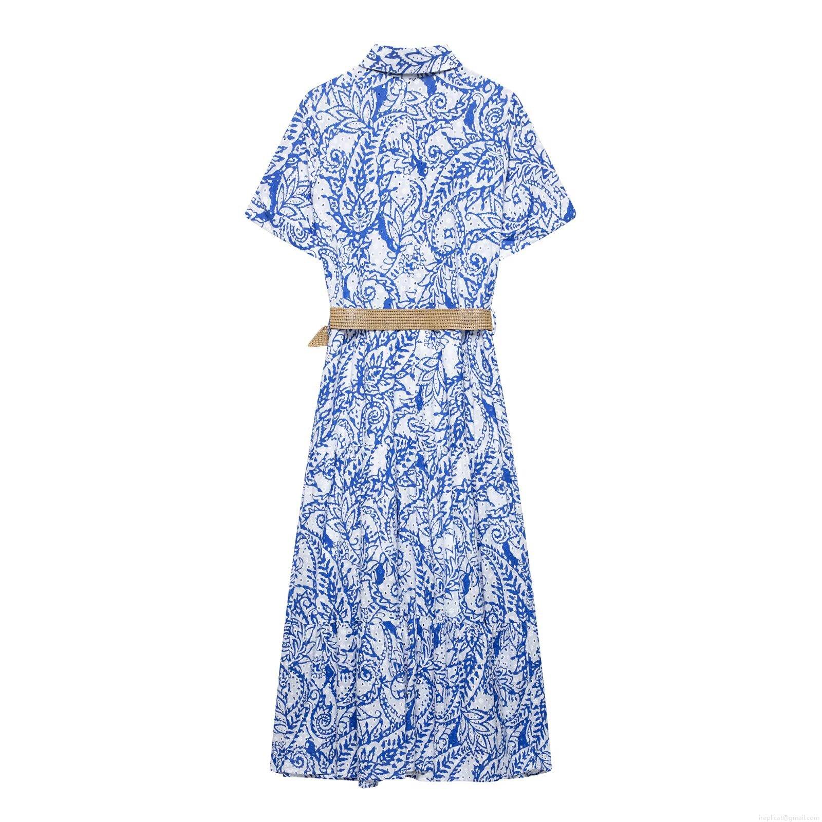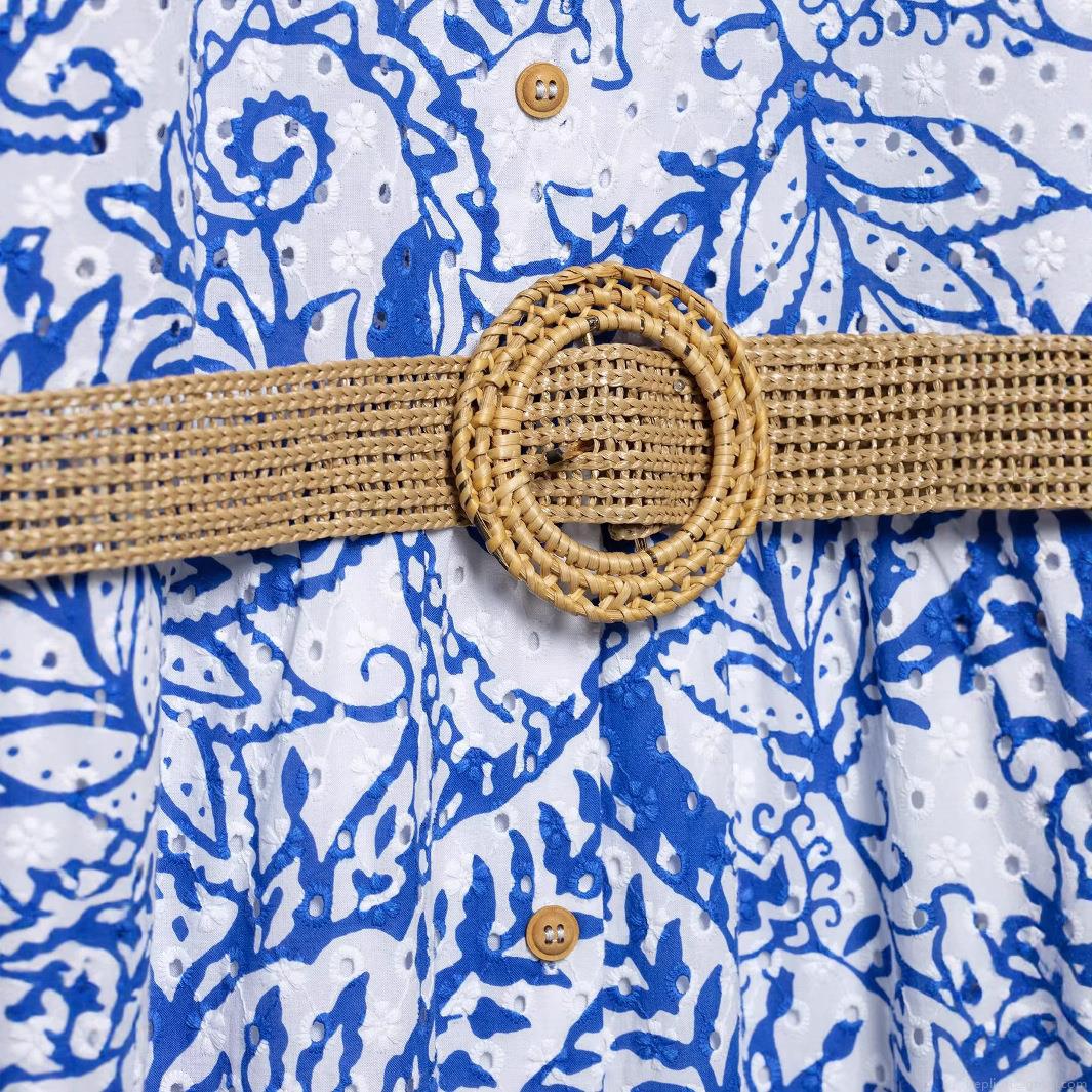• Women's Paisley Printed Eyelet Embroidery Short Sleeve Shirt Maxi Dress With Straw Belt Wooden Buttons Summer Boho Vacation Casual Long Robe