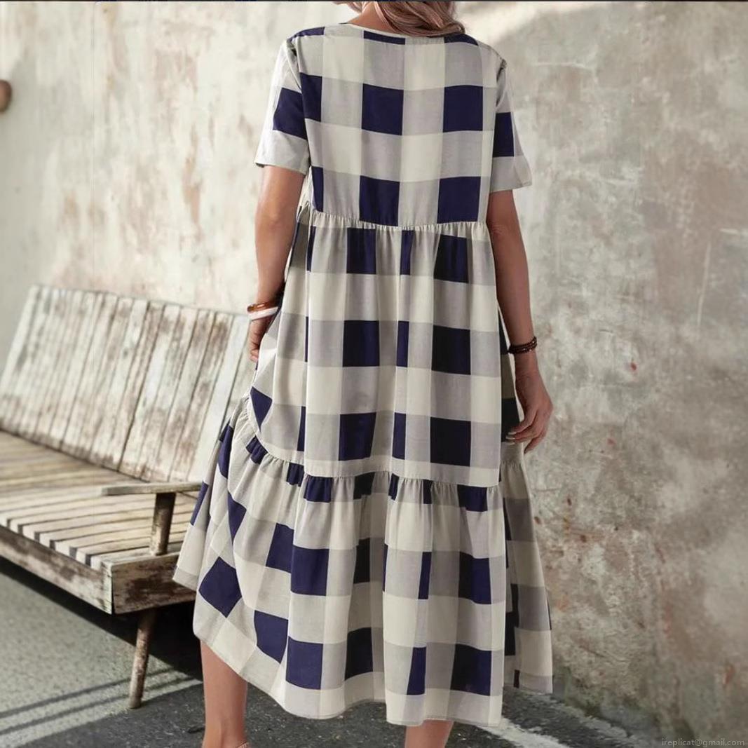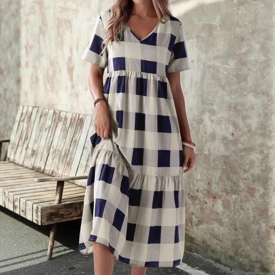 • Women's Plaid Maxi Dress V Neck Short Sleeve Polyester Spandex Milk Silk Fabric Boho Summer Beach Vacation Gingham Check Printed Loose Fit Plus Size Dress