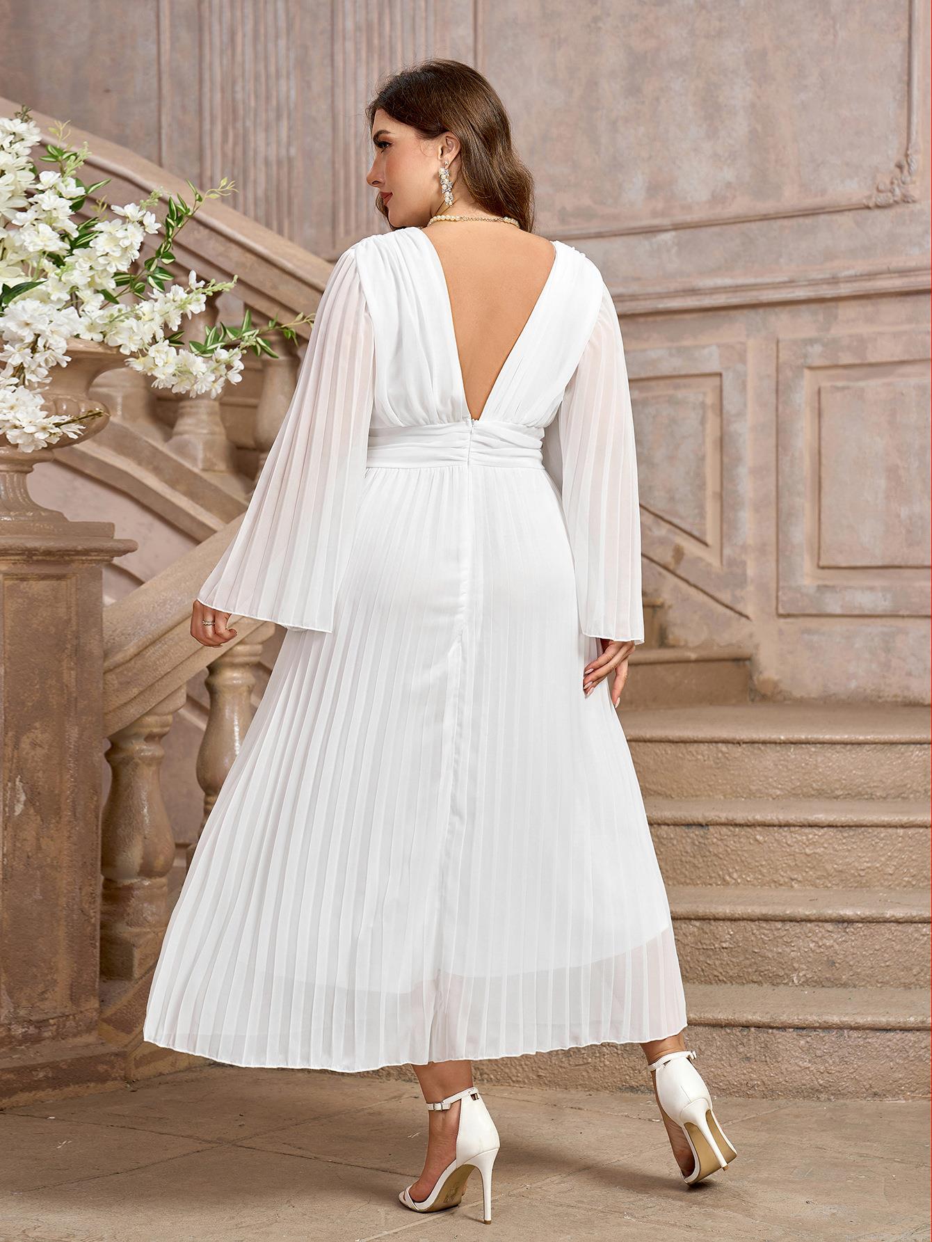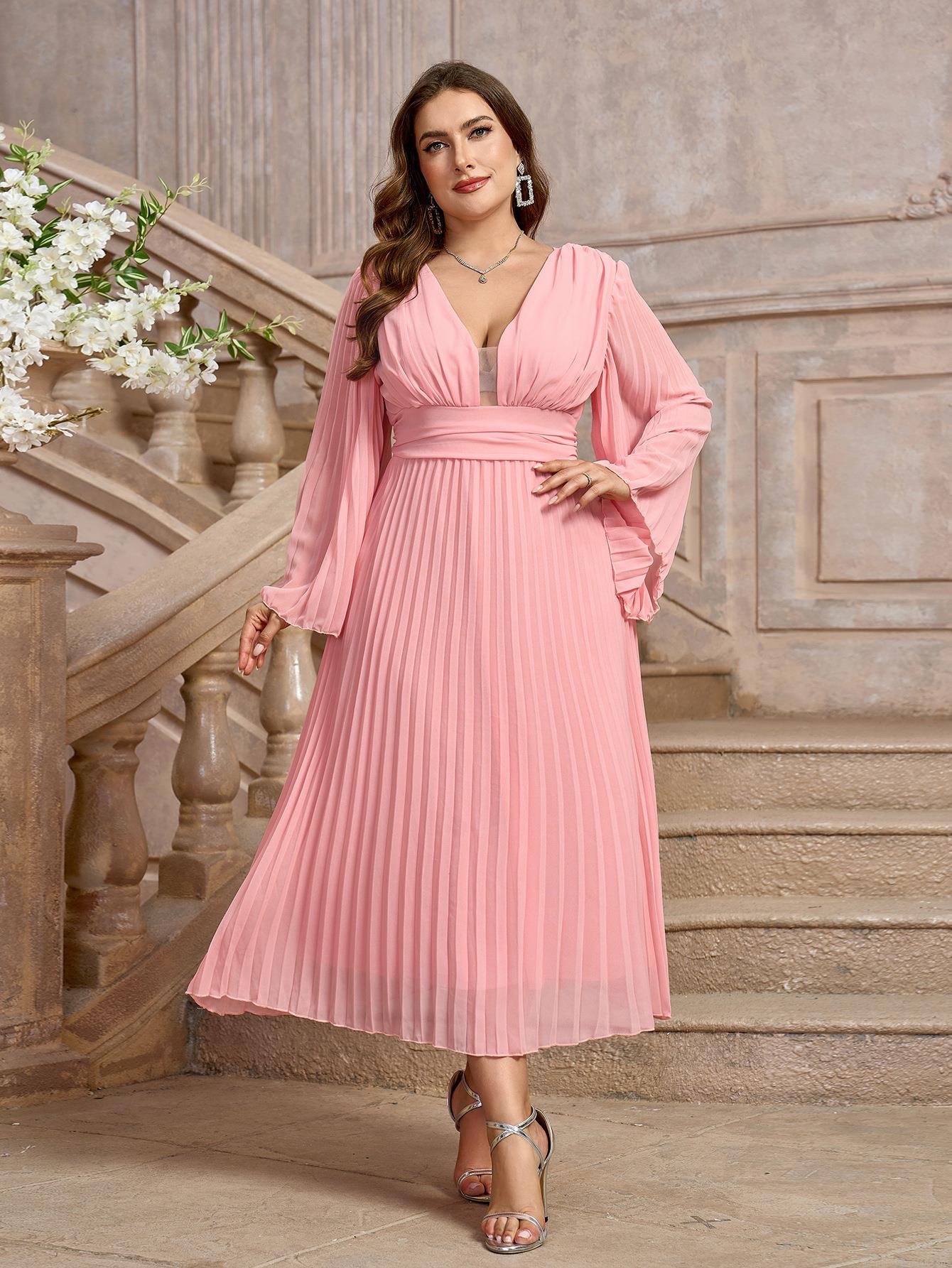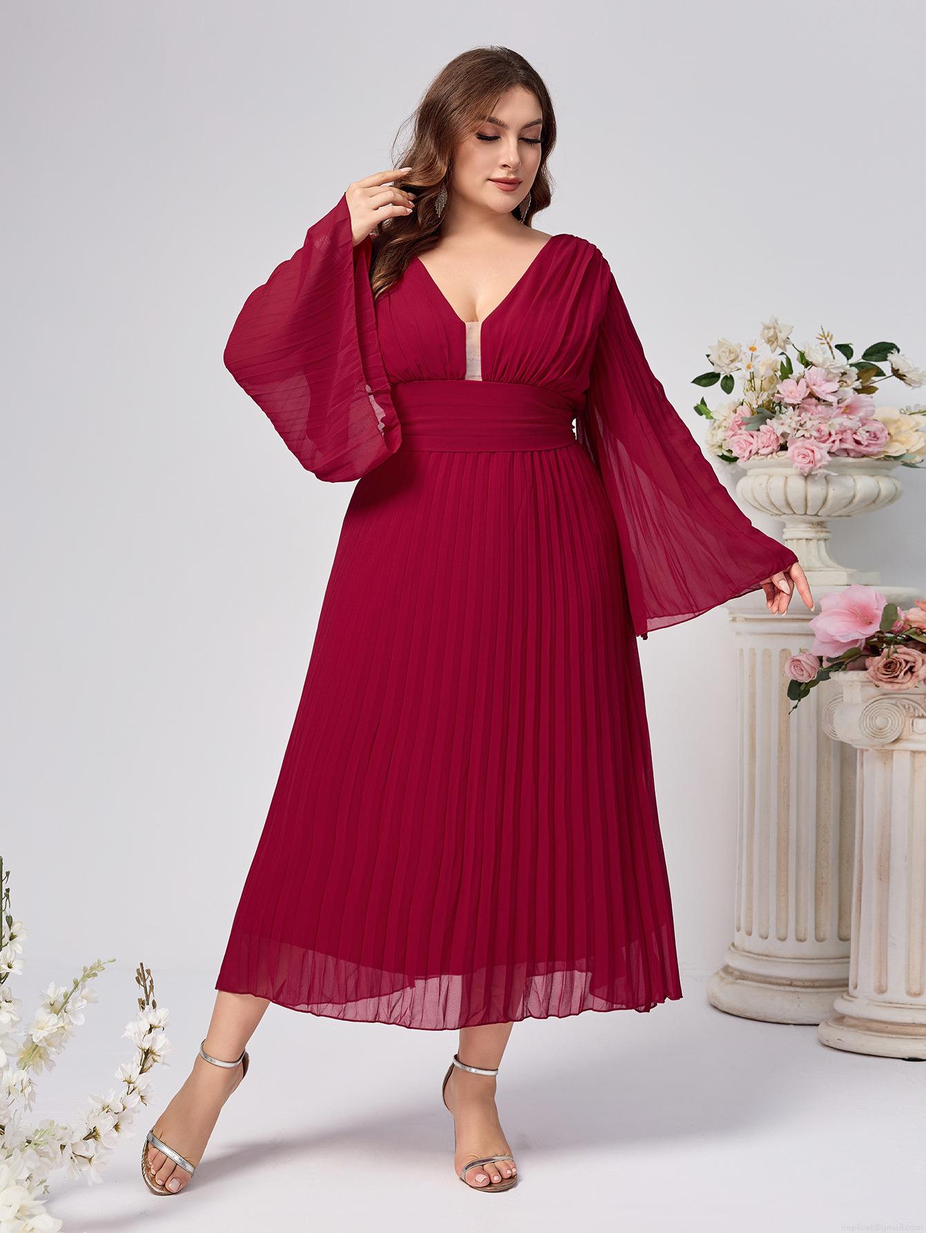 Women's Plus Size Chiffon Maxi Dress Sexy V-Neck Long Sleeve Pleated Party Evening Dress Elegant High Waist Bell Sleeve Gown Pink White Wine Red Apricot
