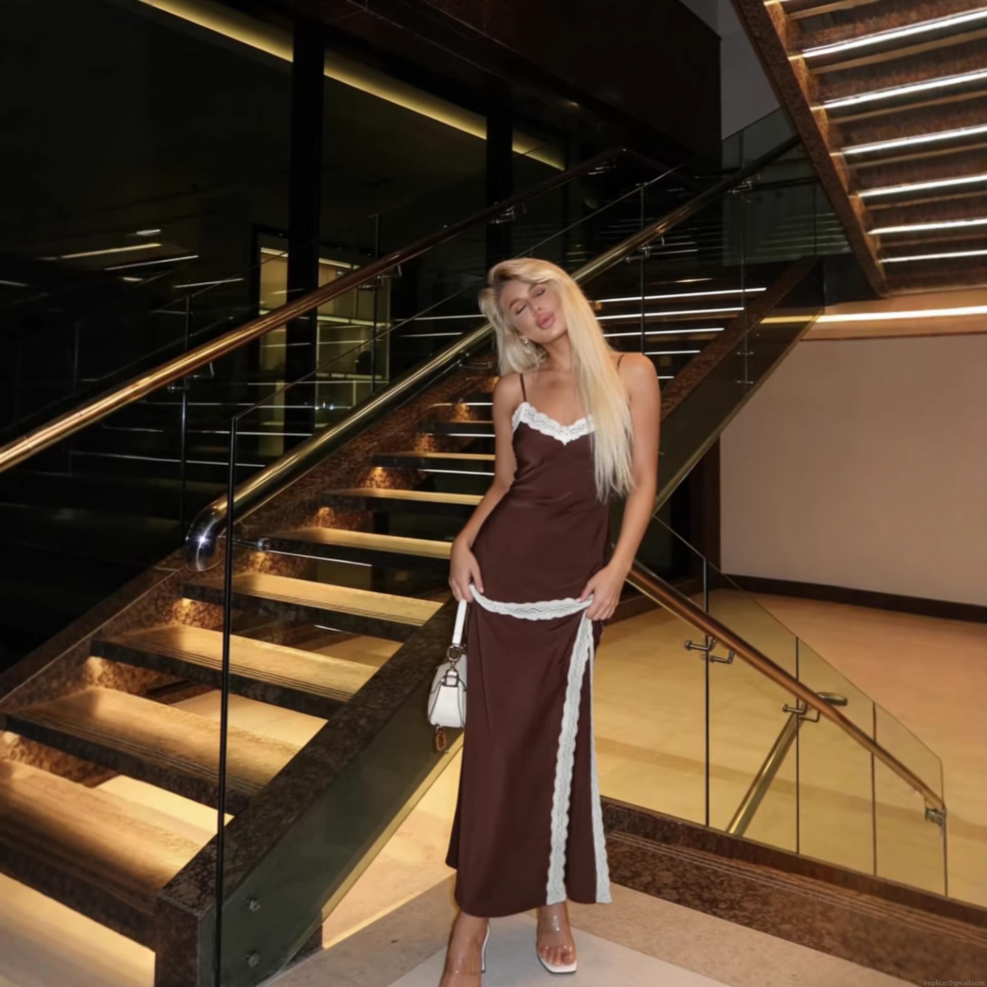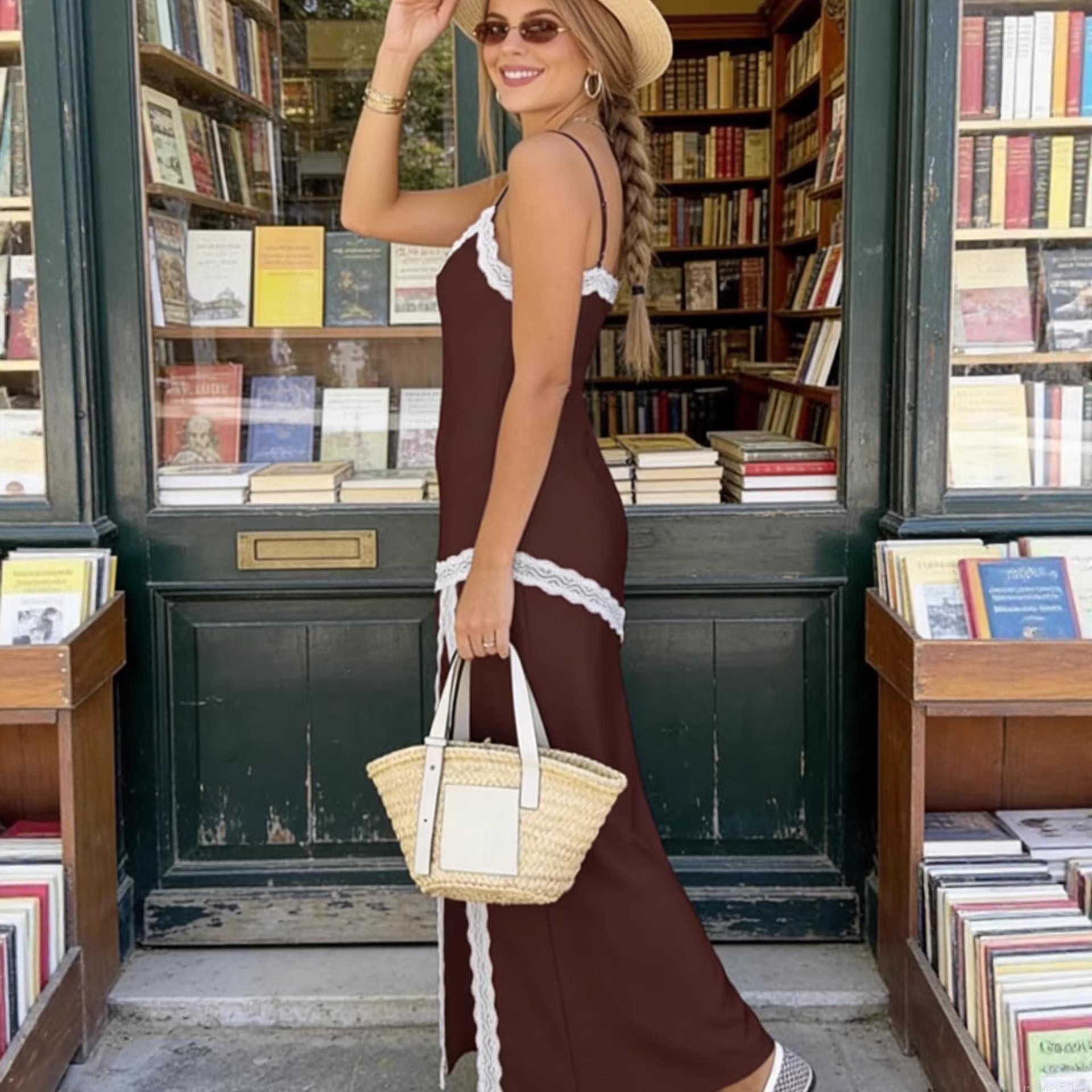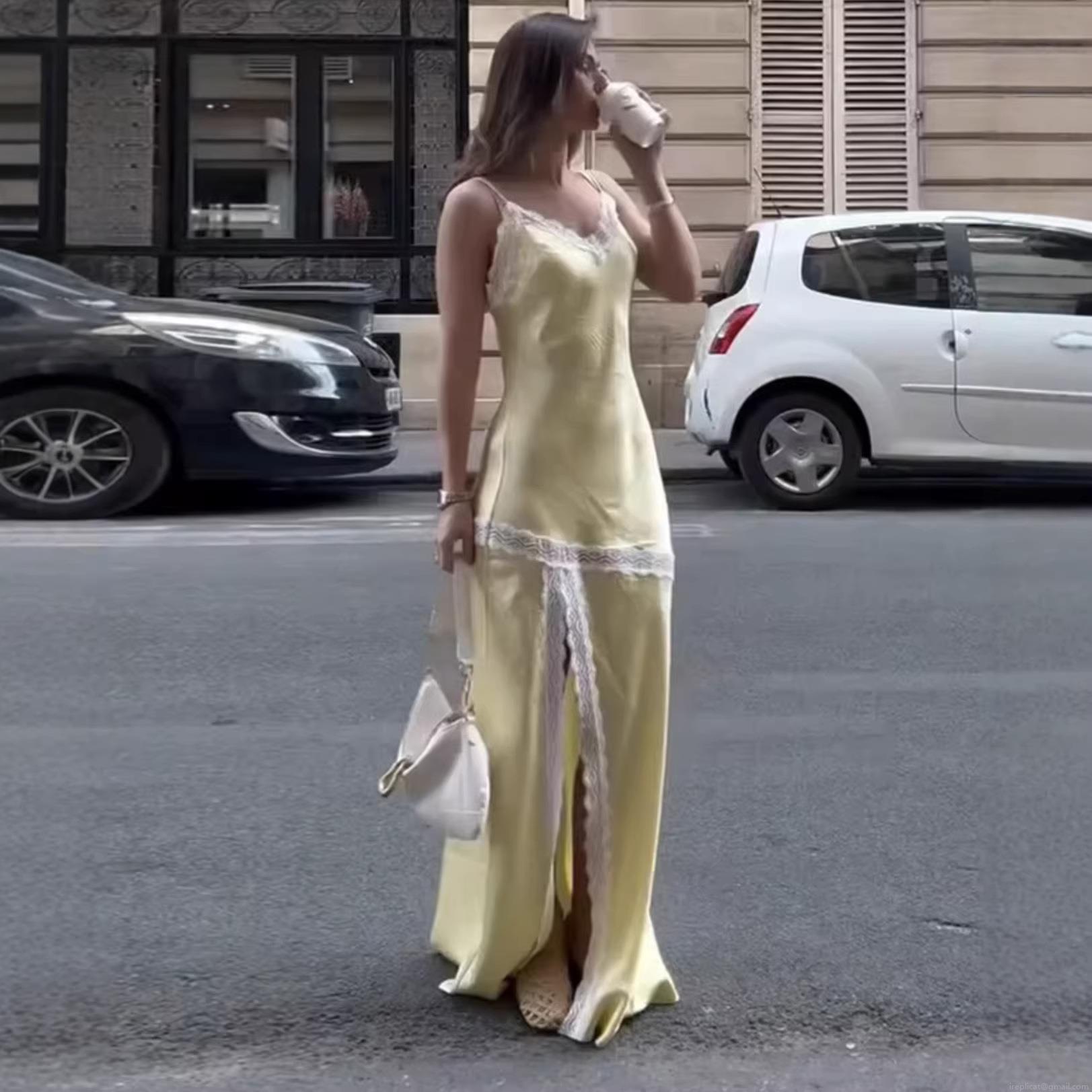 • Women's Polyester Satin Lace Trim Camisole Maxi Dress Sexy High Slit V-Neck Backless Long Dress For Summer Vacation Party Elegant Dress