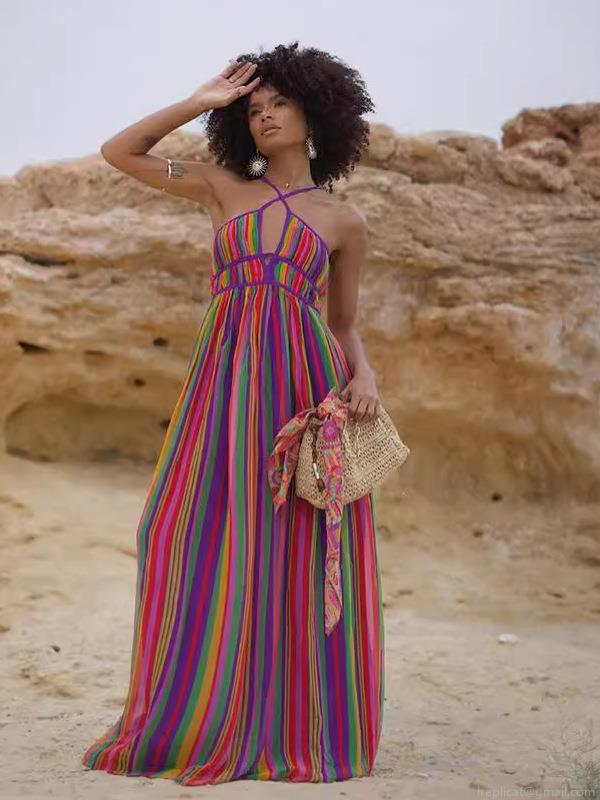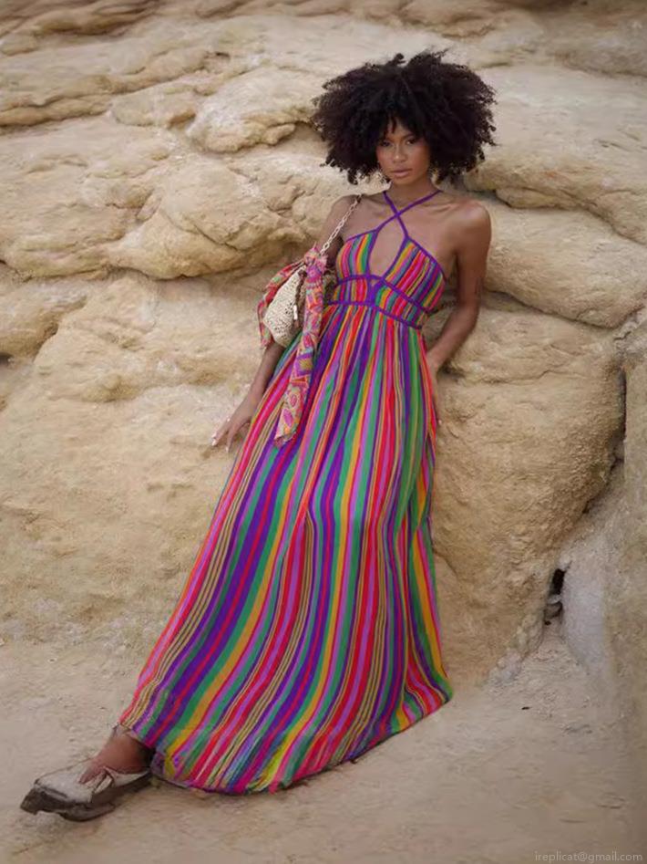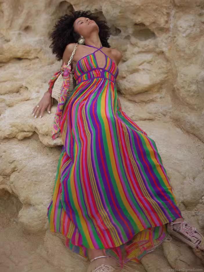 Gradient, Rainbow Stripes, Neckband, V-neck, Backless, Big Swing