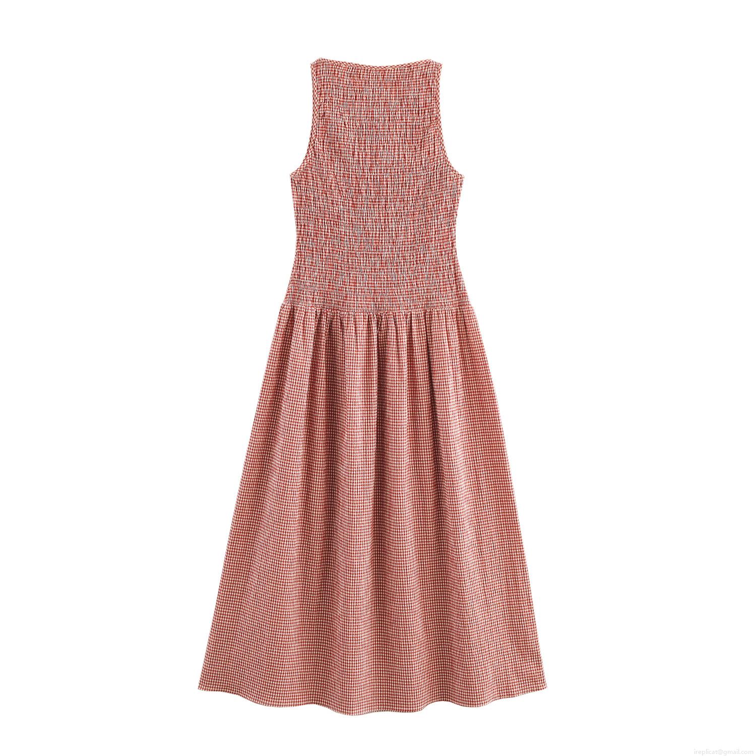 • Women's Red White Plaid Smocked Sleeveless Maxi Dress Summer A-Line Checkered Long Gown Sweet Academy Style Polyester Sundress with Elastic Bodice
