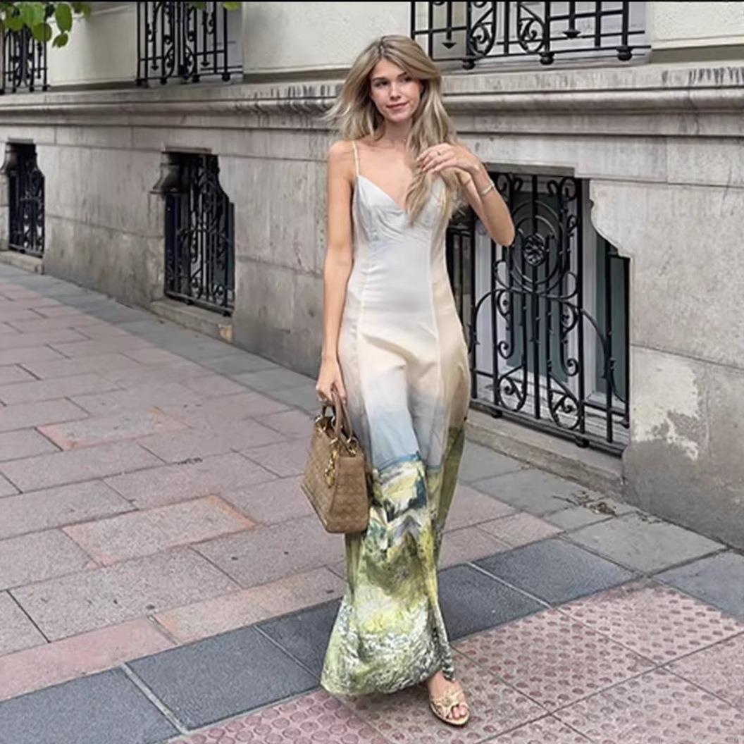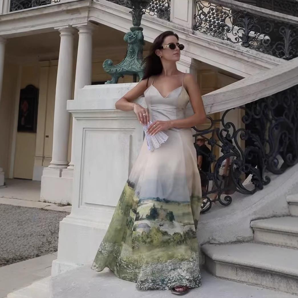 • Women's Retro Artistic Landscape Print Cami Maxi Dress Elegant V-Neck Slim Fit Oil Painting Sling Dress For Summer Party Vacation Elegant Socialite Style