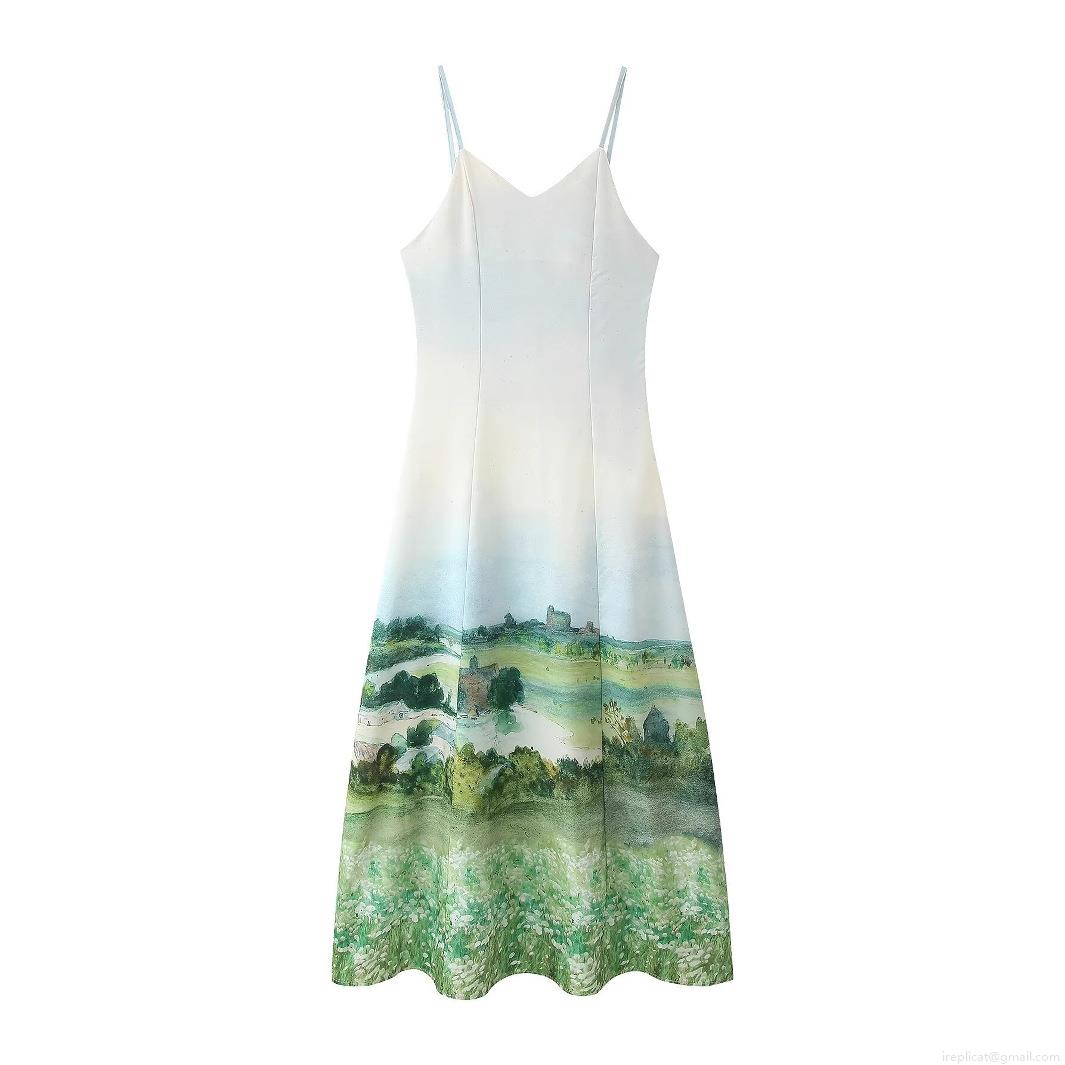 Waist shaping, Printing, V-neck, Suspenders, Landscape Prints, Pastoral Oil Painting Prints