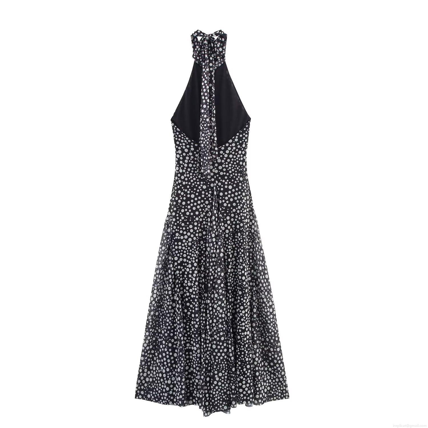 • Women's Retro Black and White Polka Dot Halter Neck Maxi Dress Elegant Backless Sleeveless Mesh Long A-Line Party Vacation Summer Dress