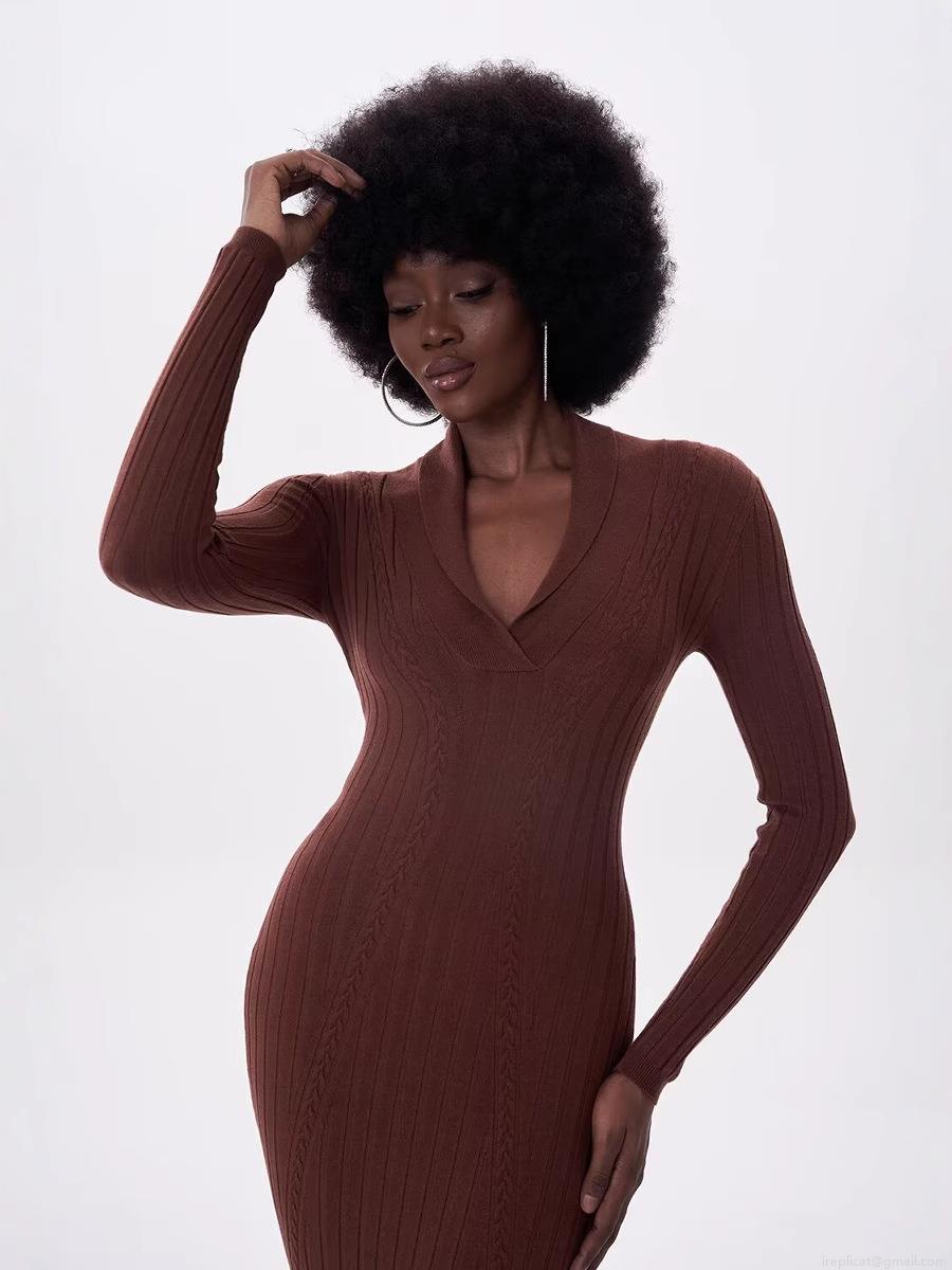 • Women's Ribbed Knit Maxi Dress Elegant Lapel V Neck Long Sleeve Bodycon Dress With Belt Casual Slim Fit Solid Color Autumn Winter Evening Dress