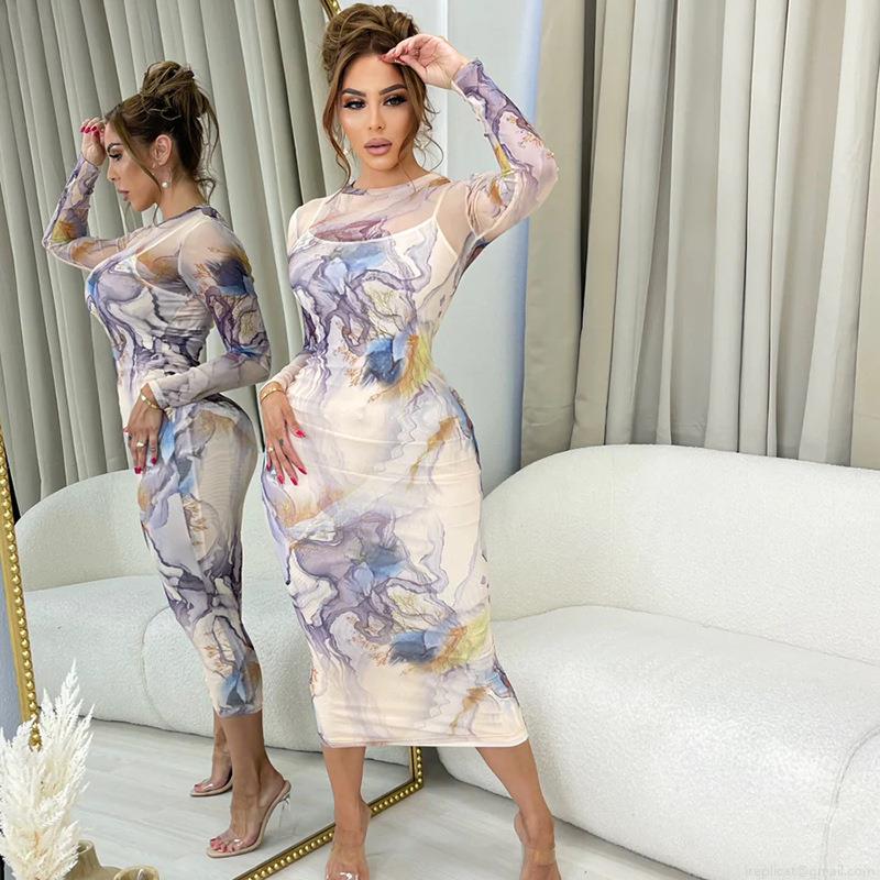 Women's Sexy Abstract Marble Print Mesh Maxi Dress Long Sleeve Round Neck Slim Fit Bodycon Party Club Night Evening Dress