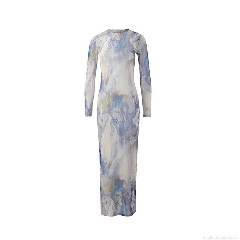 • Women's Sexy Abstract Marble Print Mesh Maxi Dress Long Sleeve Round Neck Slim Fit Bodycon Party Club Night Evening Dress