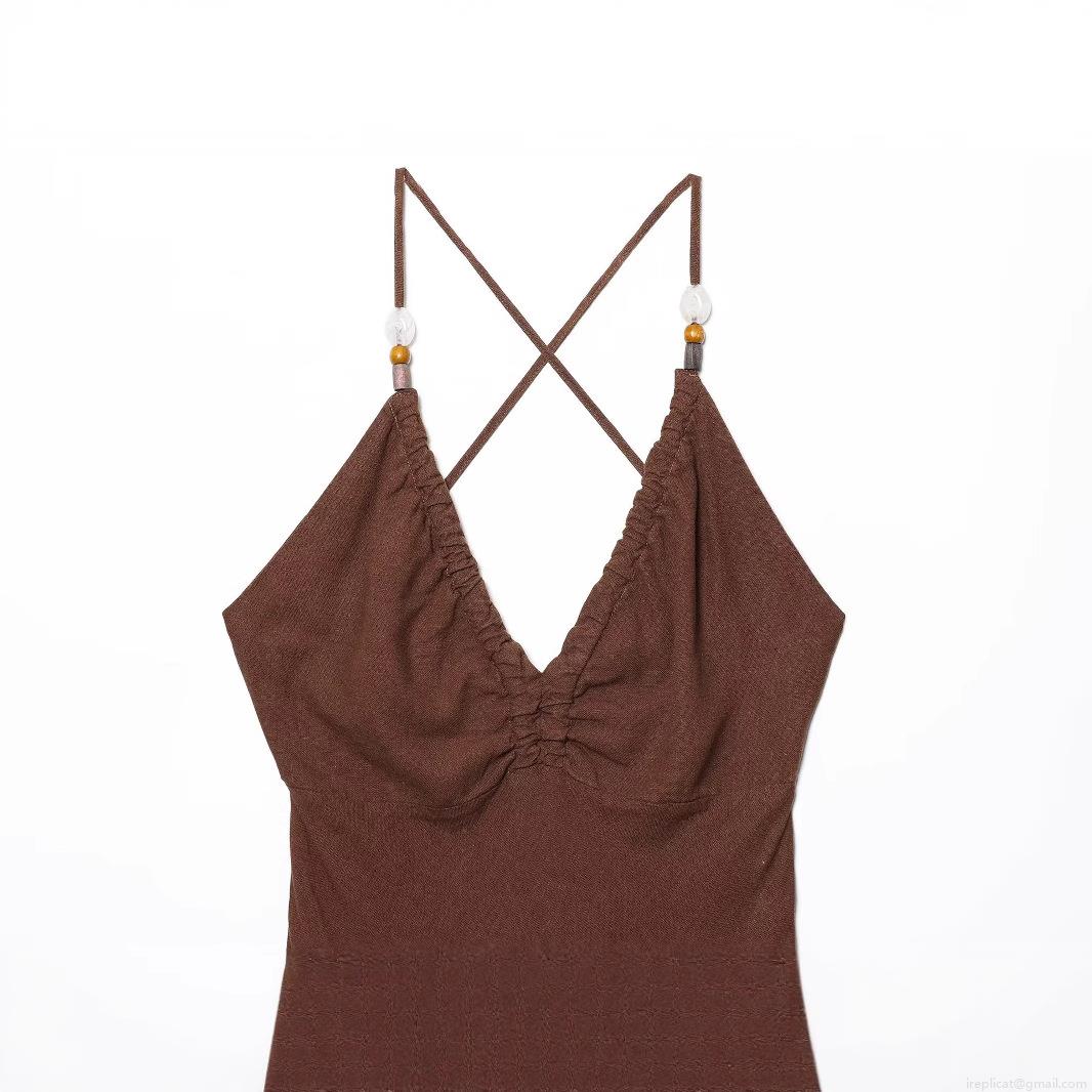 • Women's Sexy Backless Beaded Linen Blend Midi Dress Summer European American Fashion Solid Color Strappy Long Dress for Vacation Beach