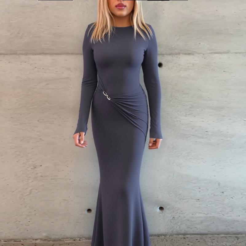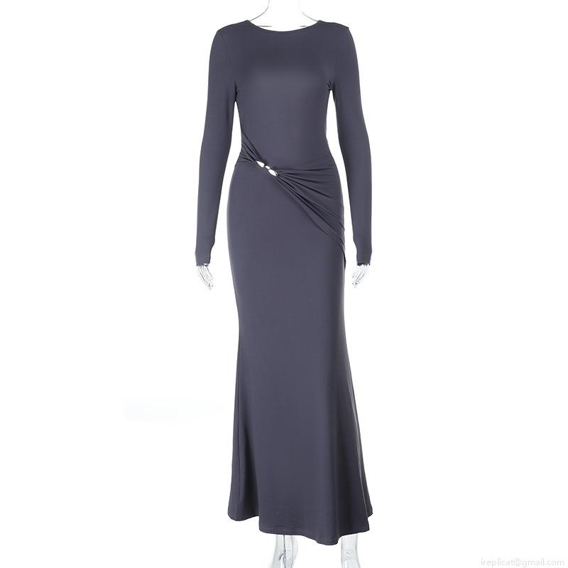 • Women's Sexy Backless Bodycon Maxi Dress Charcoal Grey Elastic Knit Long Sleeve Floor Length Slim Fit Party Clubwear Evening Gown