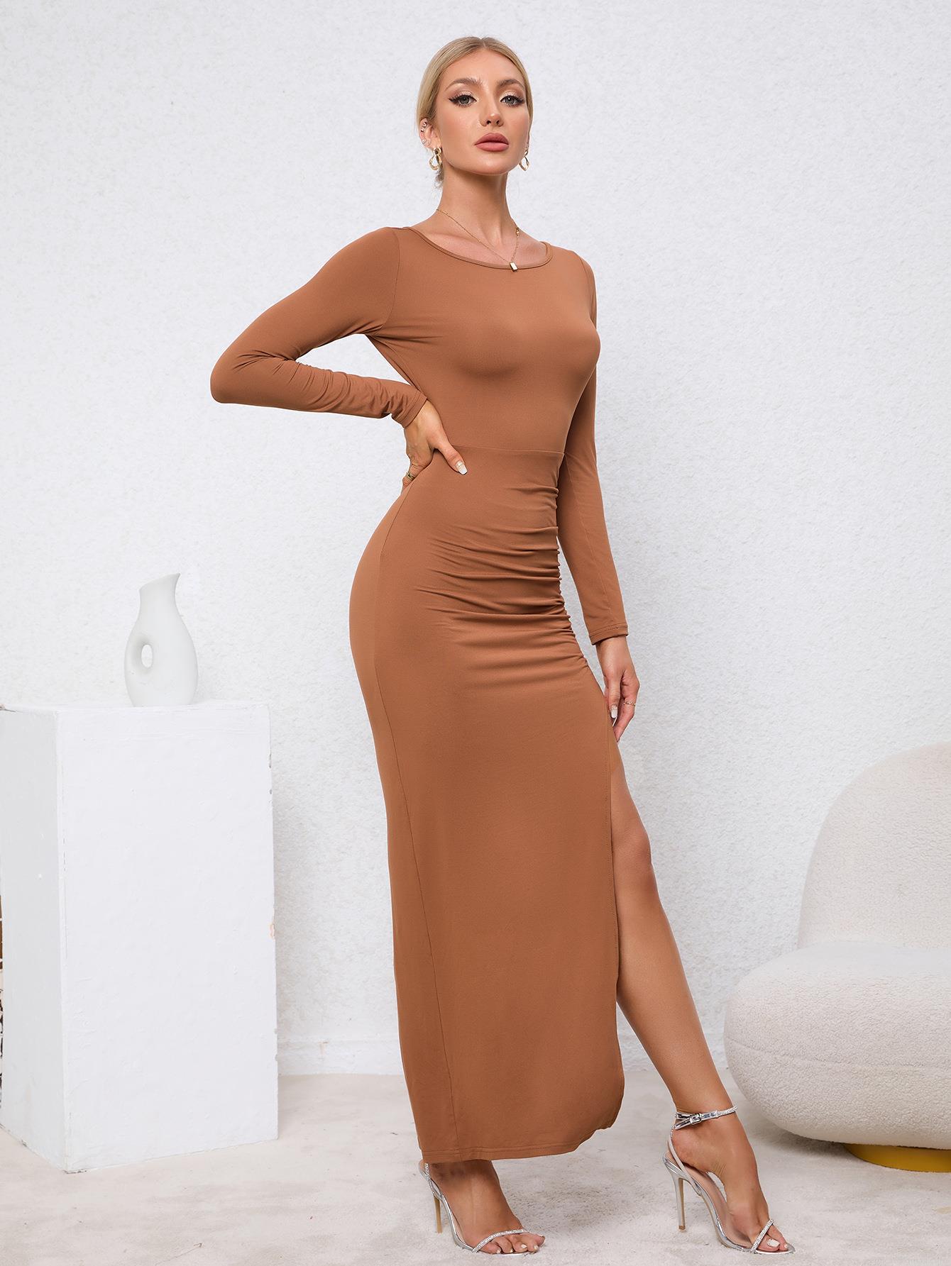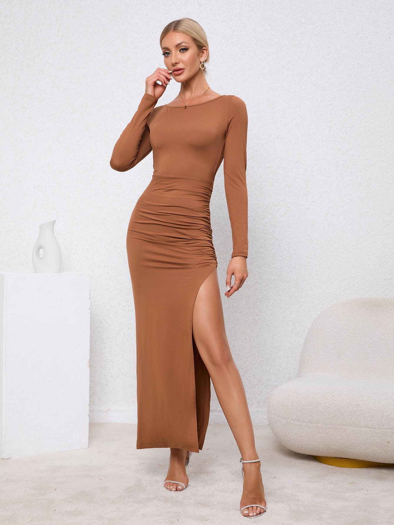• Women's Sexy Backless Bodycon Maxi Dress Long Sleeve High Slit Knit Dress 95% Polyester 5% Elastane Solid Color Caramel Brown Evening Party Club Wear