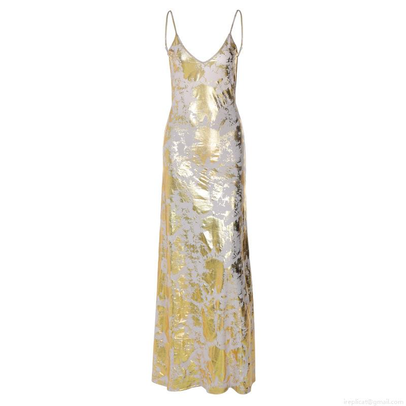 • Women's Sexy Backless Bronzing Cami Maxi Dress Elegant Gold Foil Abstract Print Deep V-Neck Sleeveless Evening Party Resort Dress 83% Polyester 17% Spandex