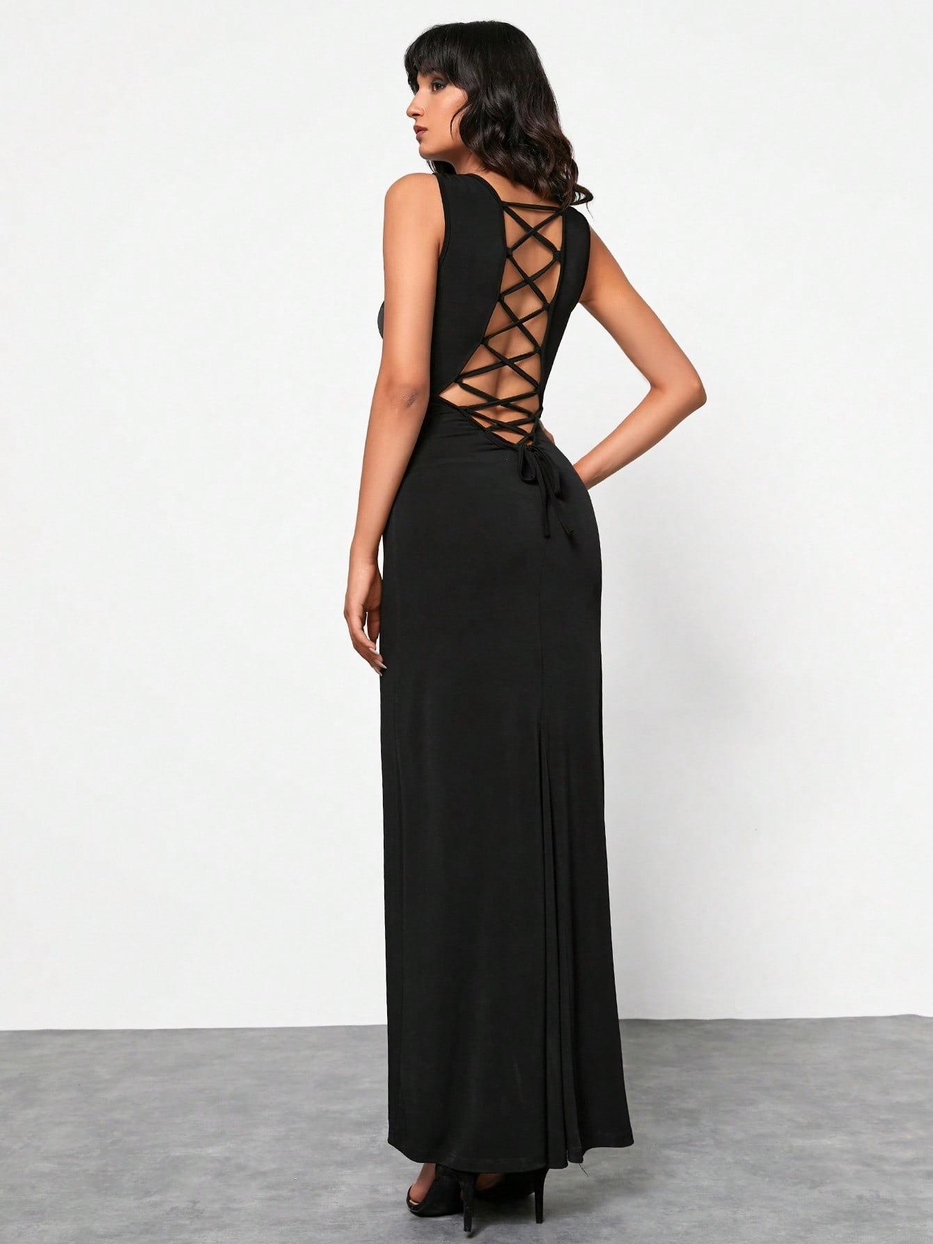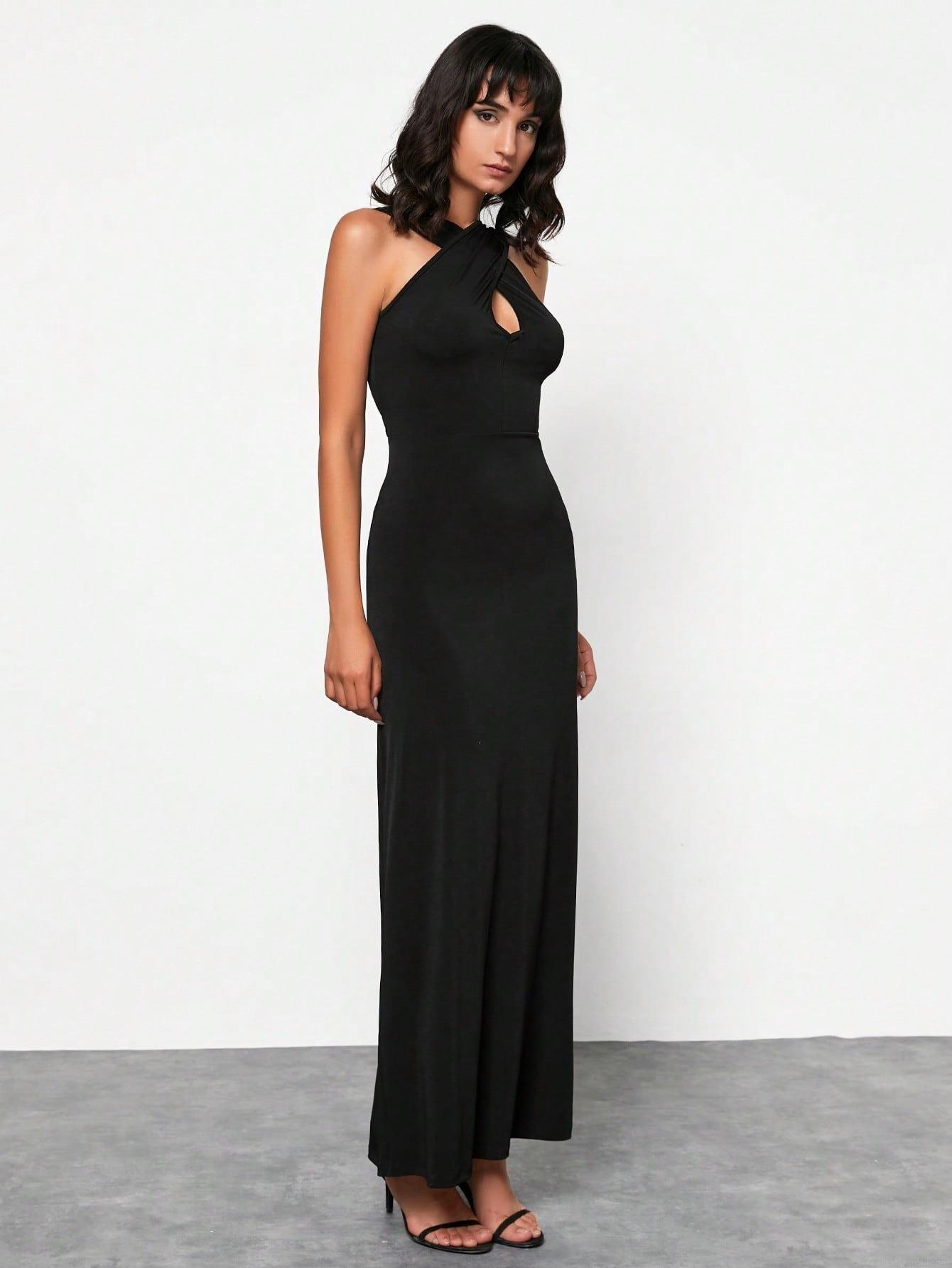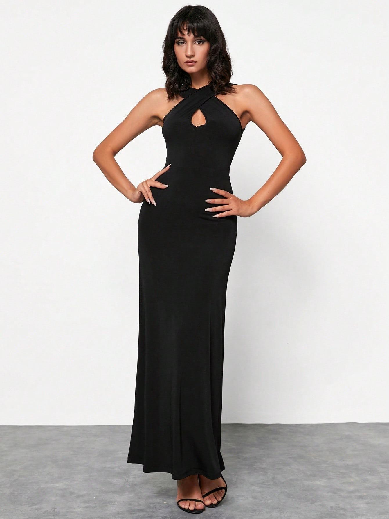 • Women's Sexy Backless Cross Halter Maxi Dress Sleeveless Cutout Slim Fit Polyester Elastane Party Evening Long Dress For Women