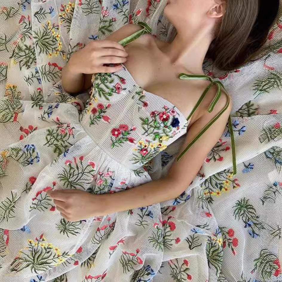 • Women's Sexy Backless Floral Embroidery Maxi Dress Mesh Crossover Strap Slip Dress Green Velvet Ribbon A-Line Long Dress for Party Wedding Summer Vacation