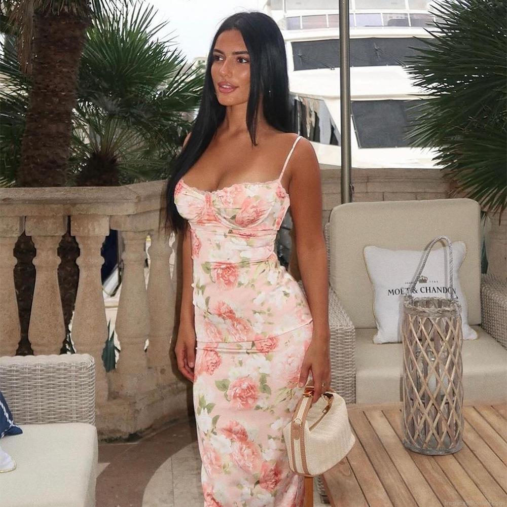 Women's Sexy Backless Floral Print Maxi Dress Satin Milk Silk V-Neck Lace Patchwork Split Long Dress For Summer Party Beach Holiday