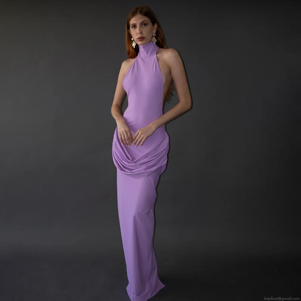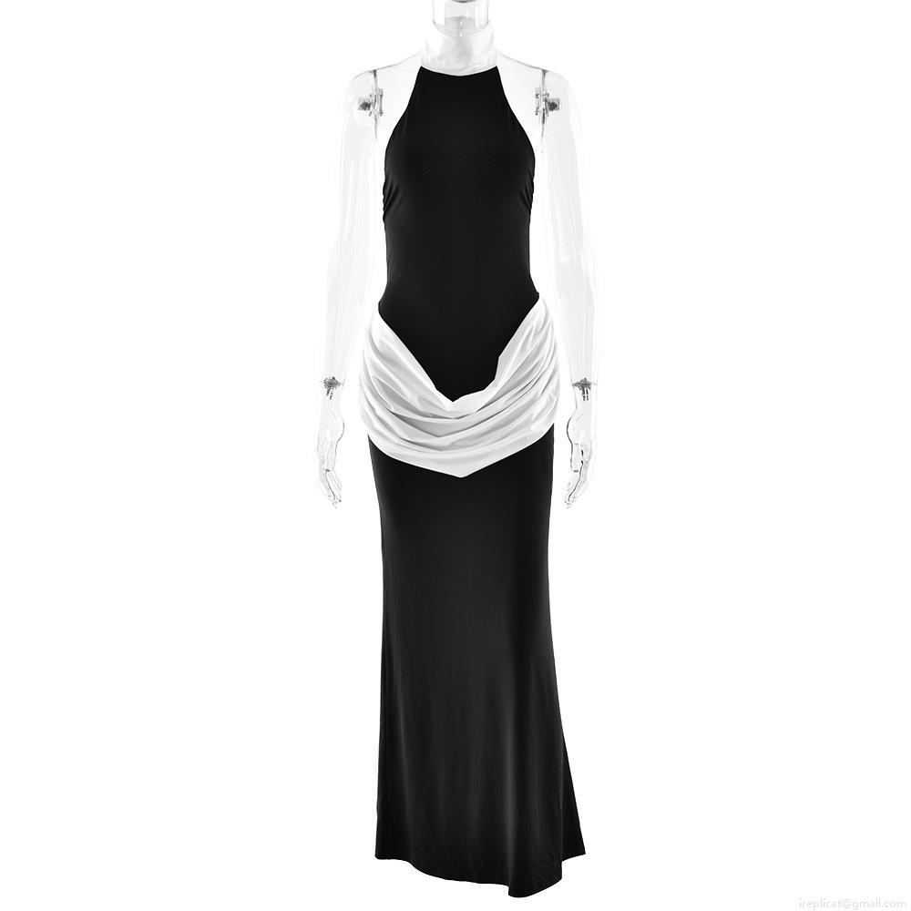 Women's Sexy Backless Halter Maxi Dress Contrast Color Block Pleated Bodycon Long Gown For Banquet Evening Party Prom Clubwear