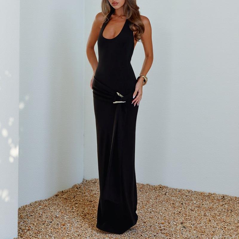 • Women's Sexy Backless Halter Maxi Dress With Metal Buckle Side Split Polyester Spandex Mesh Spliced Long Evening Party Dress For Elegant Summer Beach Clubwear