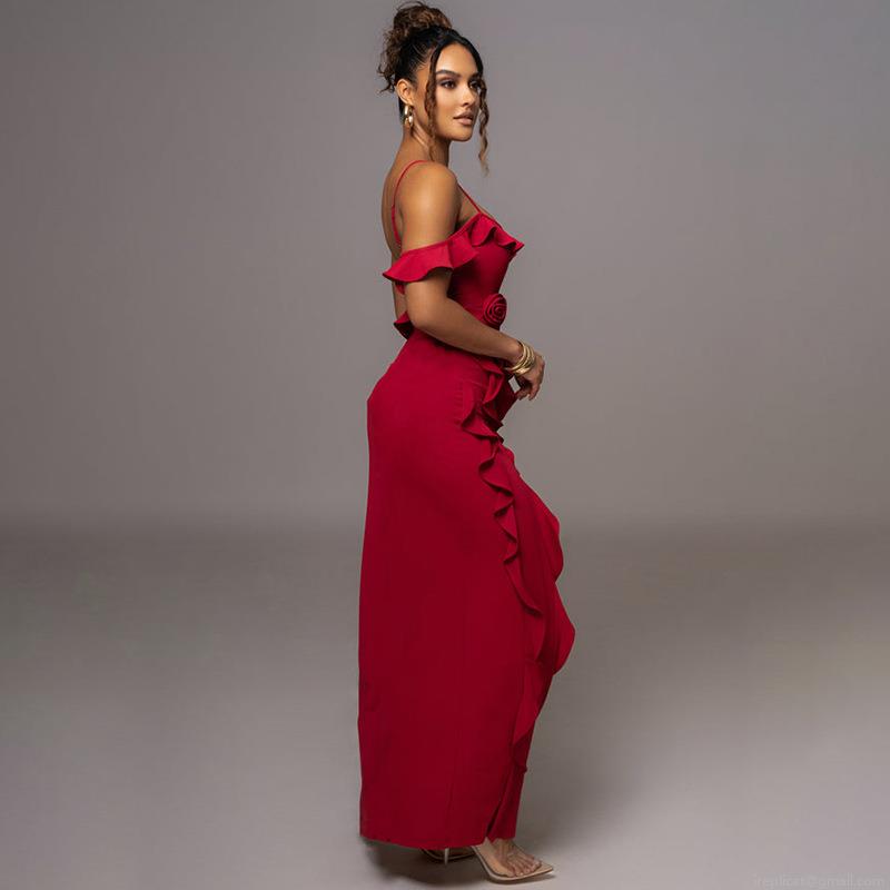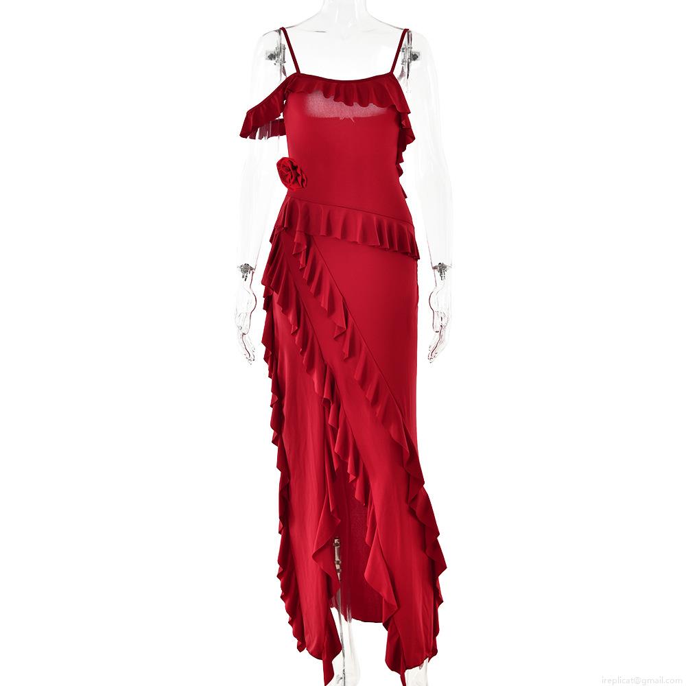Backless, 3d Flower Decoration, Side Fork, Multi-layered Ruffles, Thin Straps