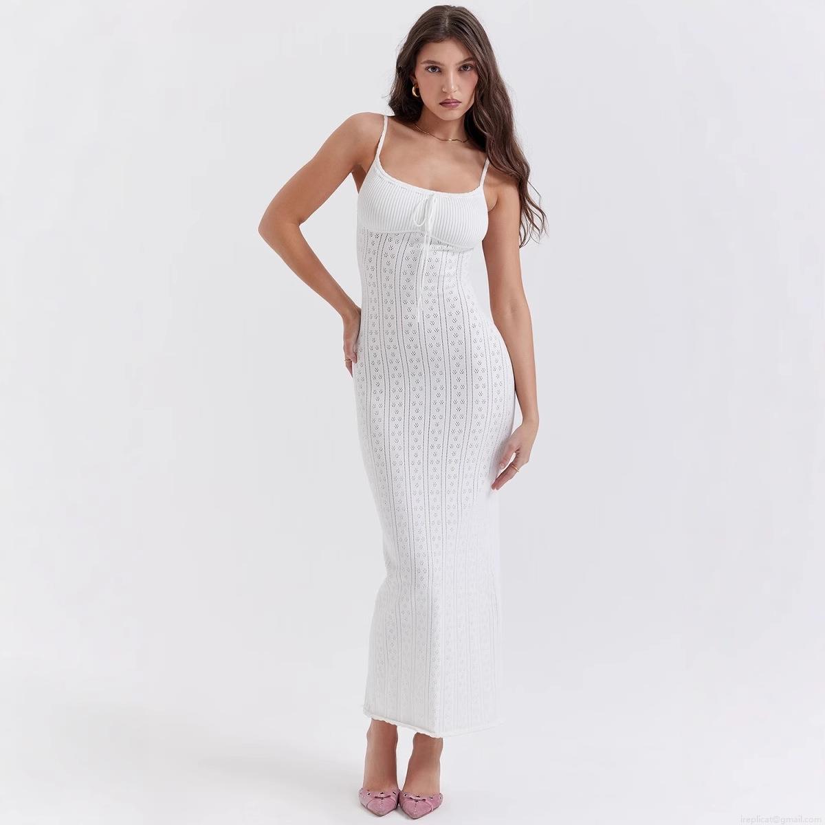 • Women's Sexy Backless Knit Maxi Dress Polyester Ribbed Pointelle Sleeveless Cami Dress With Front Tie Square Neck Bodycon Long Dress For Party Clubwear Vacation