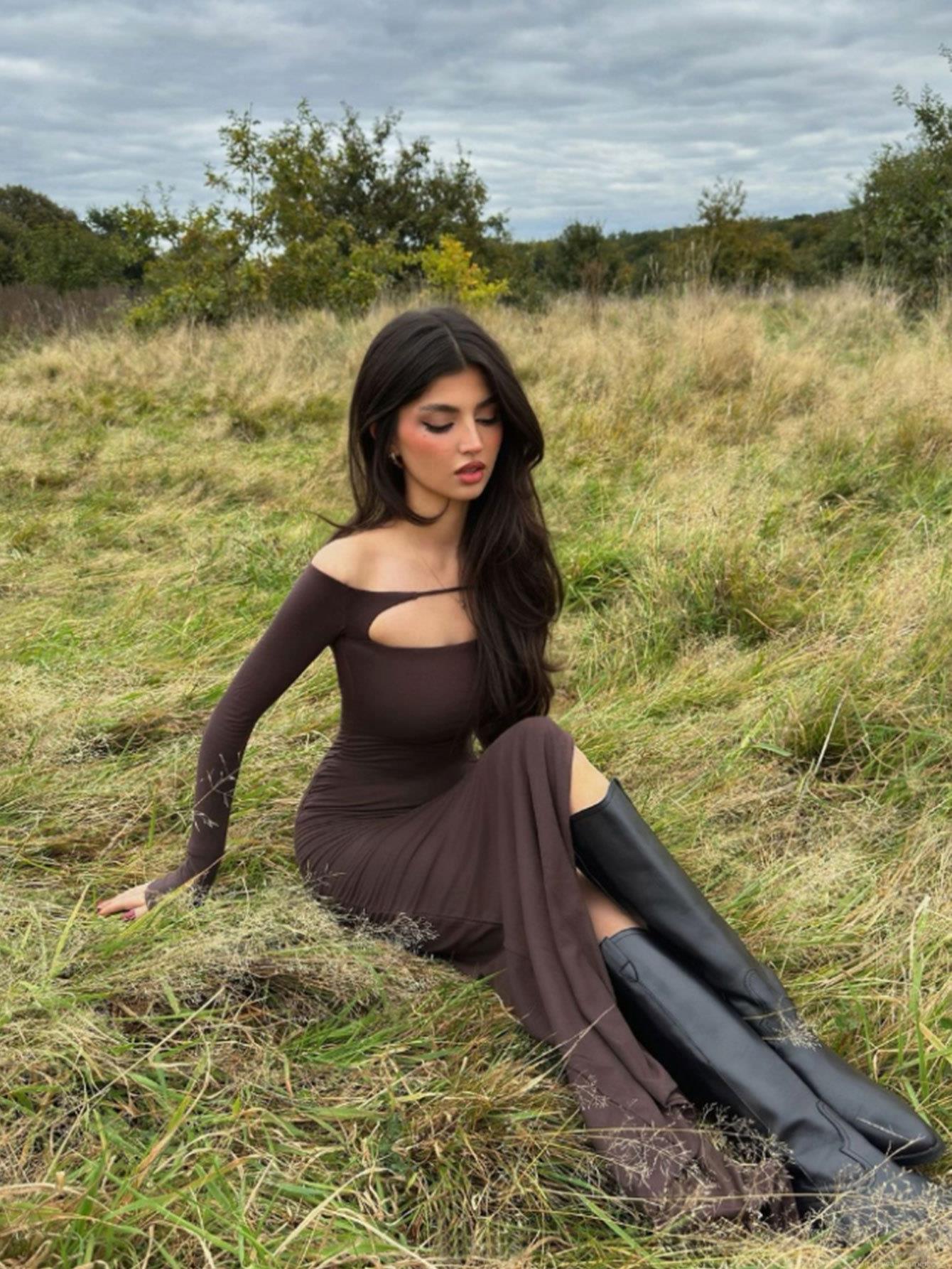 Women's Sexy Backless Knitted Maxi Dress Long Sleeve Off Shoulder Slim Fit Solid Coffee Brown Socialite Style Bodycon Long Skirt Evening Party Outfit