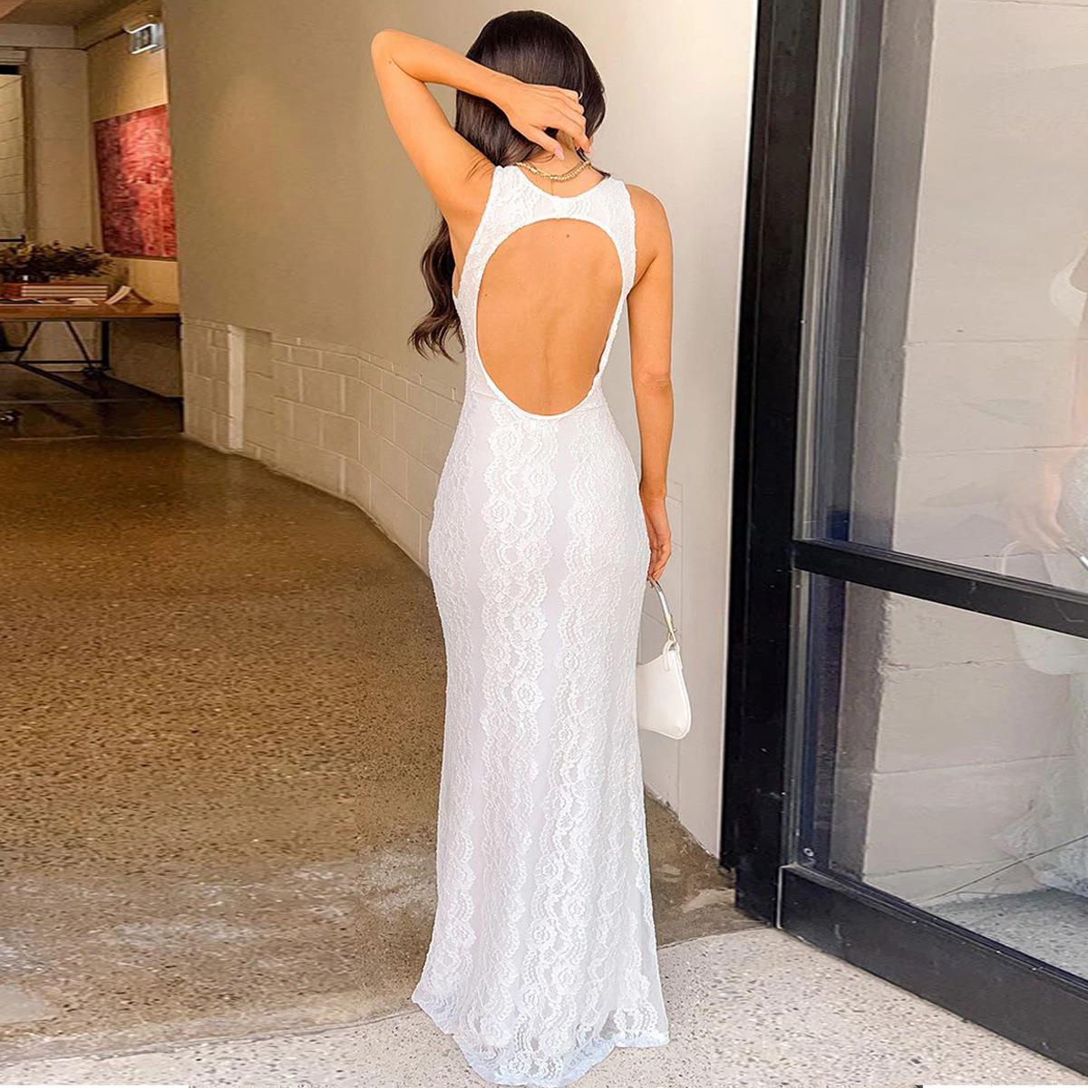 Women's Sexy Backless Lace Maxi Dress Polyester Spandex V-Neck Sleeveless Slim Fit Floor Length Evening Gown For Party Vacation Elegant Wedding Guest Dresses