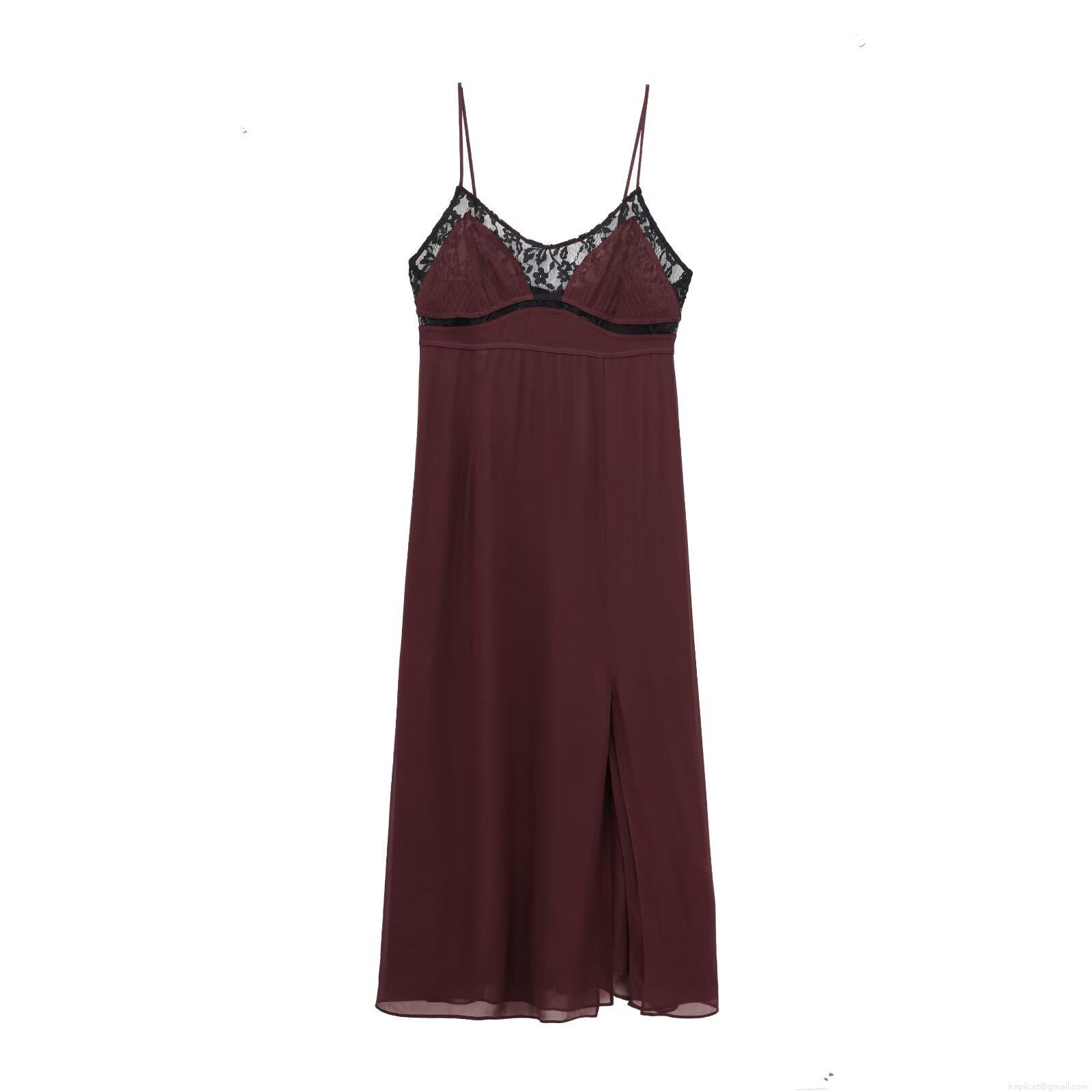 Solid Color, Backless, Lace Patchwork, Side Fork, Thin Straps, Invisible Zipper