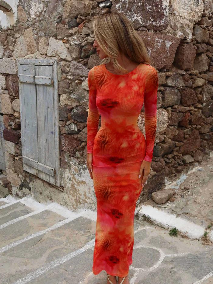 • Women's Sexy Backless Mesh Maxi Dress Long Sleeve Abstract Tie Dye Print Bodycon Clubwear Party Dress Slim Fit Ankle Length Vacation Outfits