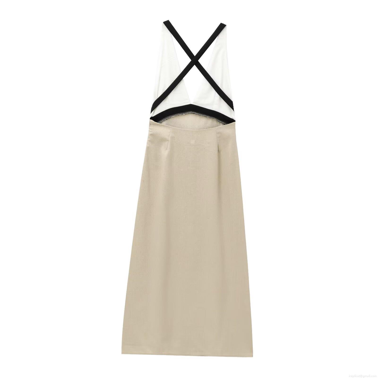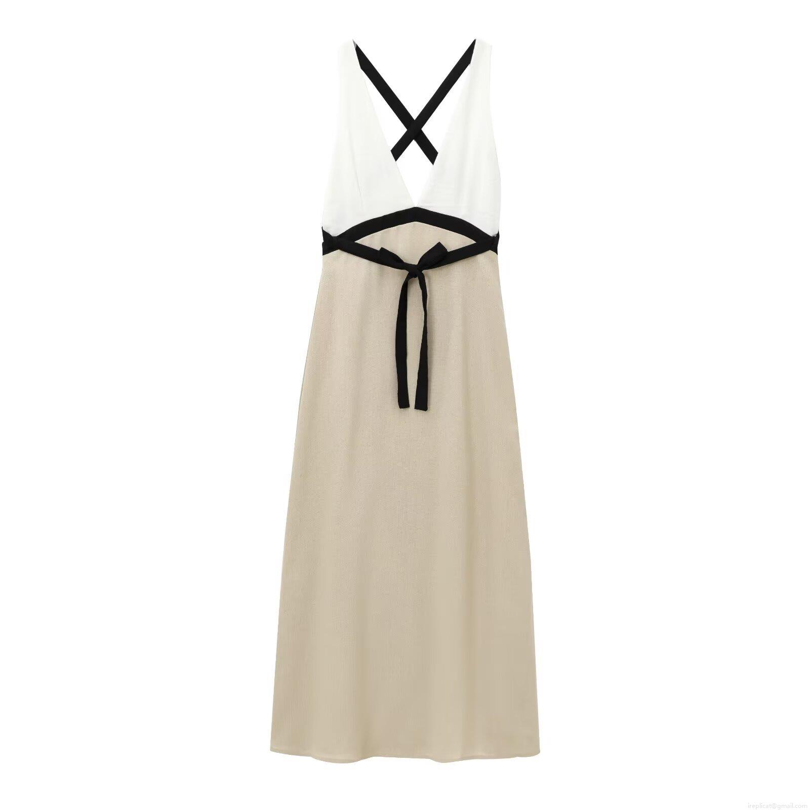 • Women's Sexy Backless Patchwork Linen Maxi Dress V Neck Sleeveless Cross Straps Sundress Casual Holiday Party Long Dress