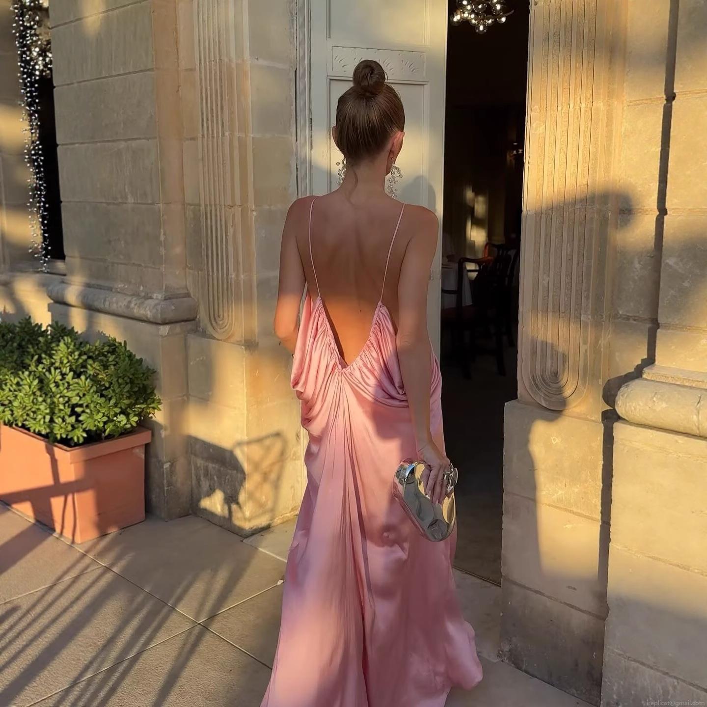 Women's Sexy Backless Satin Maxi Dress Elegant V Neck Pleated Camisole Evening Party Prom Long Gown Celebrity Style Pink Slip Dress