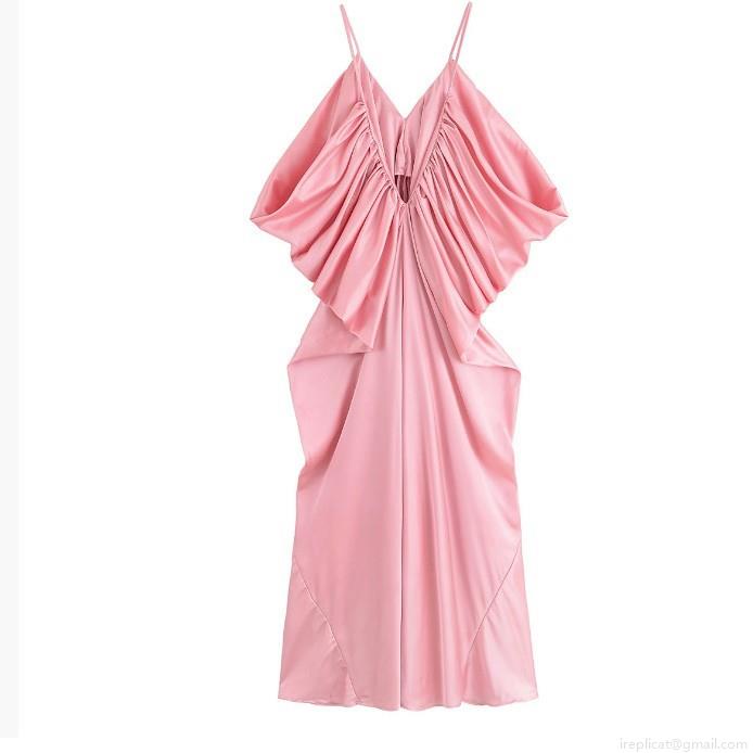 • Women's Sexy Backless Satin Maxi Dress Elegant V Neck Pleated Camisole Evening Party Prom Long Gown Celebrity Style Pink Slip Dress