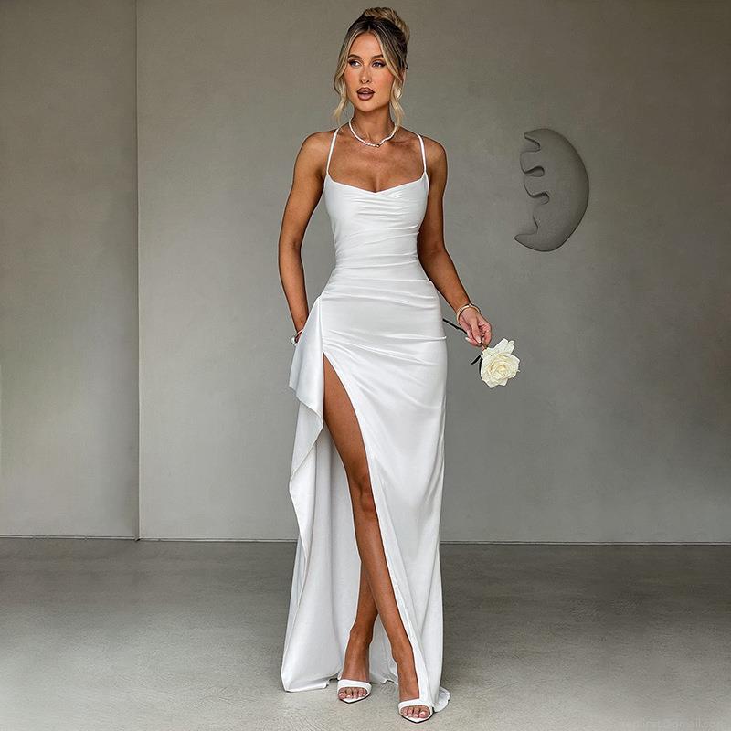 Solid Color, Pleats, Lace, Backless, Forked, Thin Straps