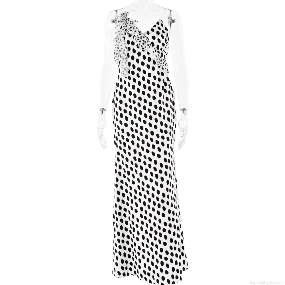 • Women's Sexy Backless Satin Polka Dot Maxi Dress Elegant V-Neck Ruffle Flower Strappy Sundress For Summer Party Vacation Resort Slim Fit Long Dress