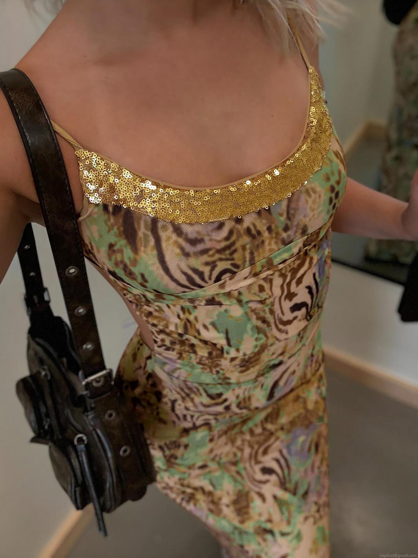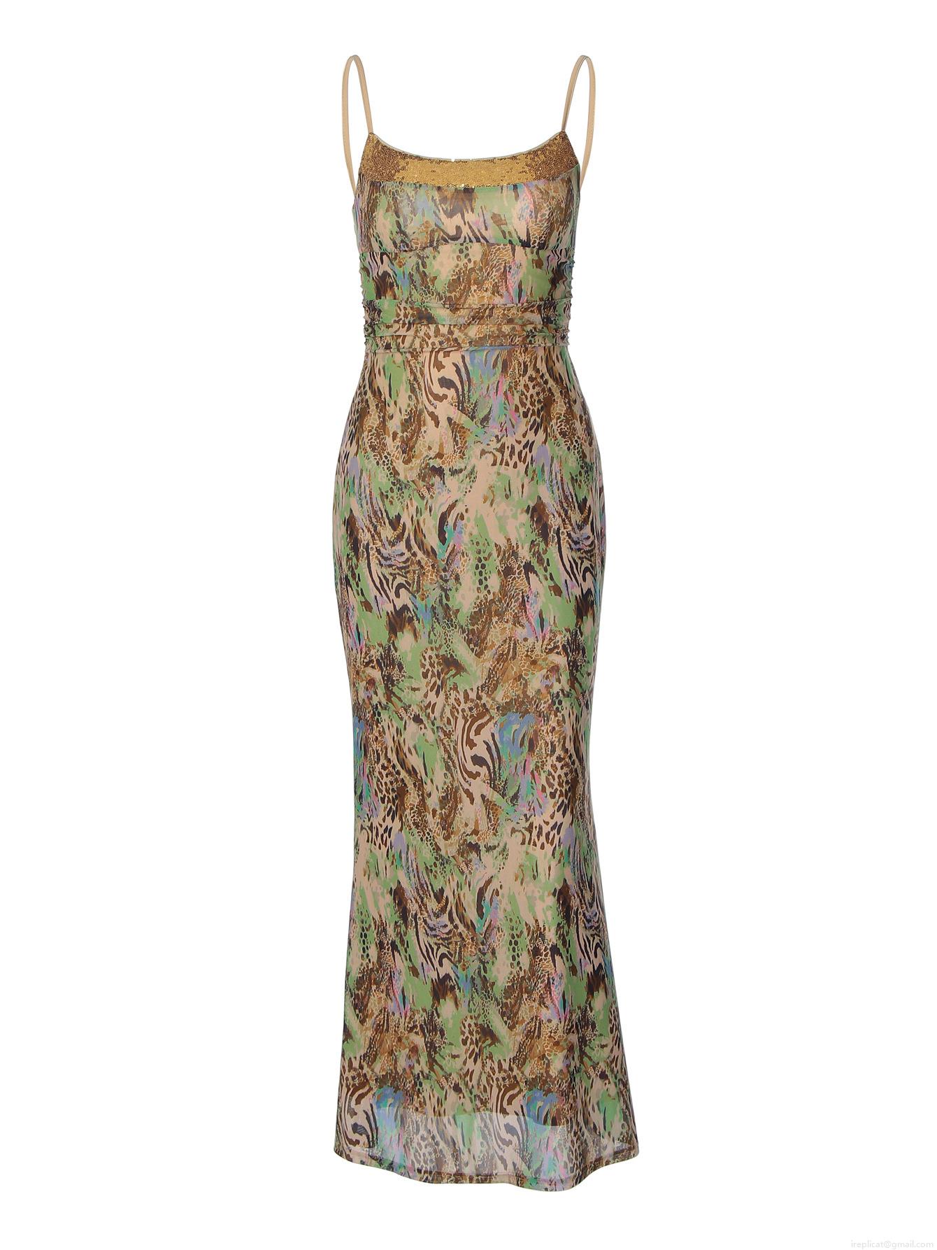 • Women's Sexy Backless Slip Maxi Dress Abstract Leopard Print Tied Neckline Gold Sequin Trim Slim Fit Sleeveless Beach Vacation Party Long Dress