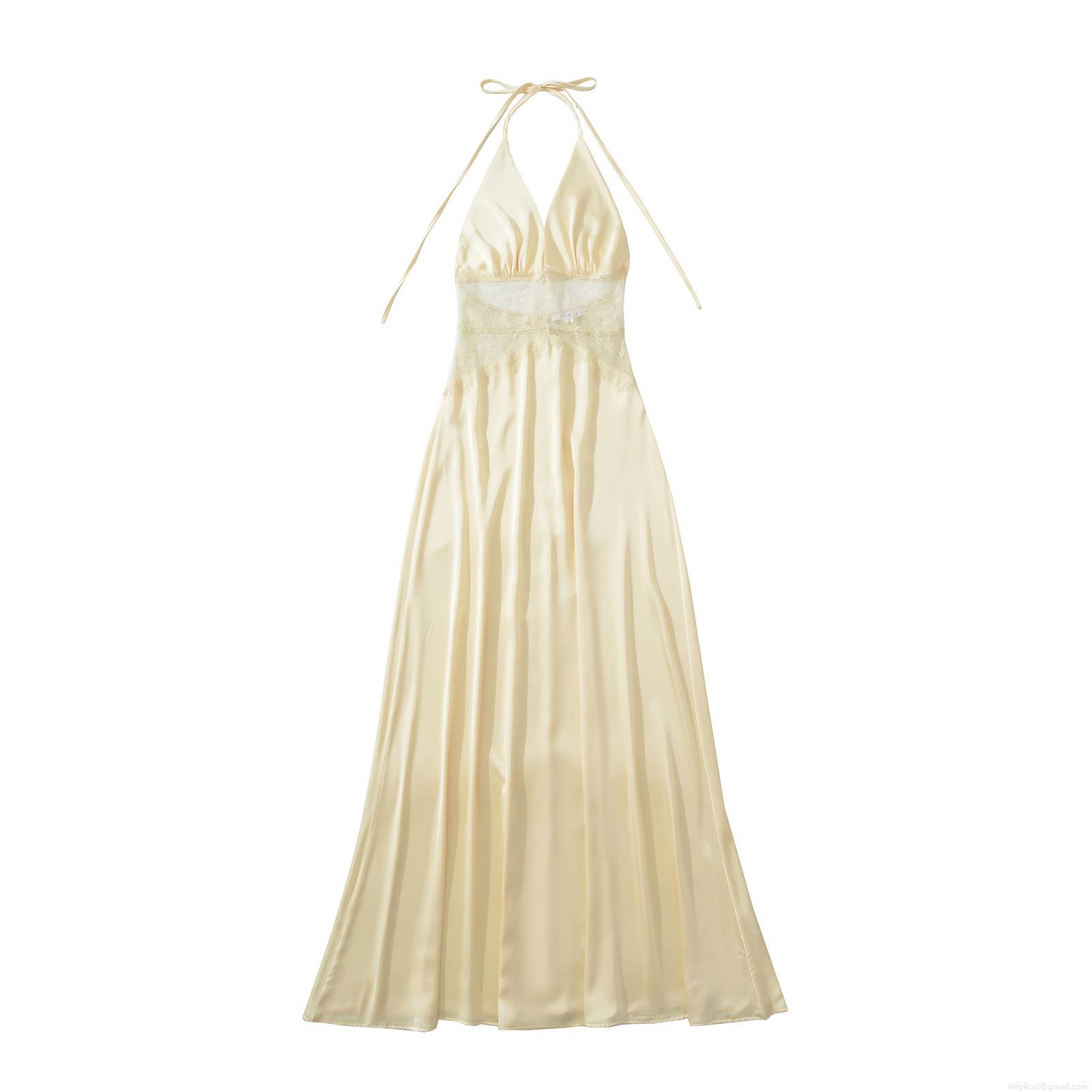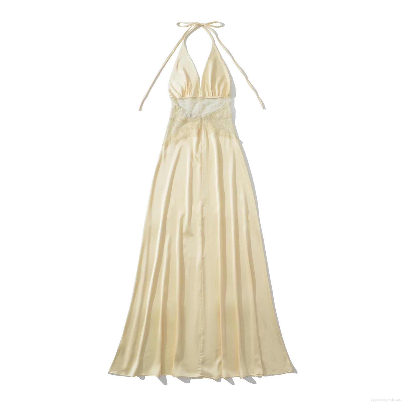 • Women's Sexy Backless V-Neck Satin Maxi Dress Lace Patchwork Halter Sleeveless Slim Fit Bodycon Evening Party Long Dress